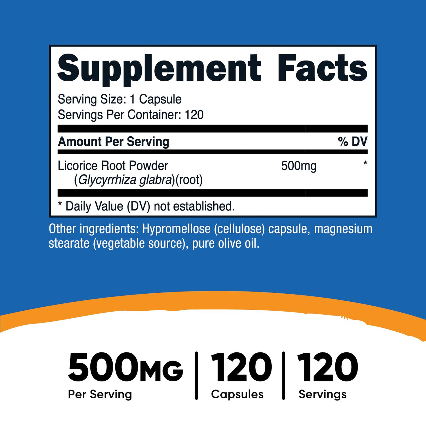 Nutricost Licorice Root contains 120 servings with 500 milligrams of licorice root in every capsule. They are non-gmo, gluten free, soy free, and made in a GMP compliant facility.