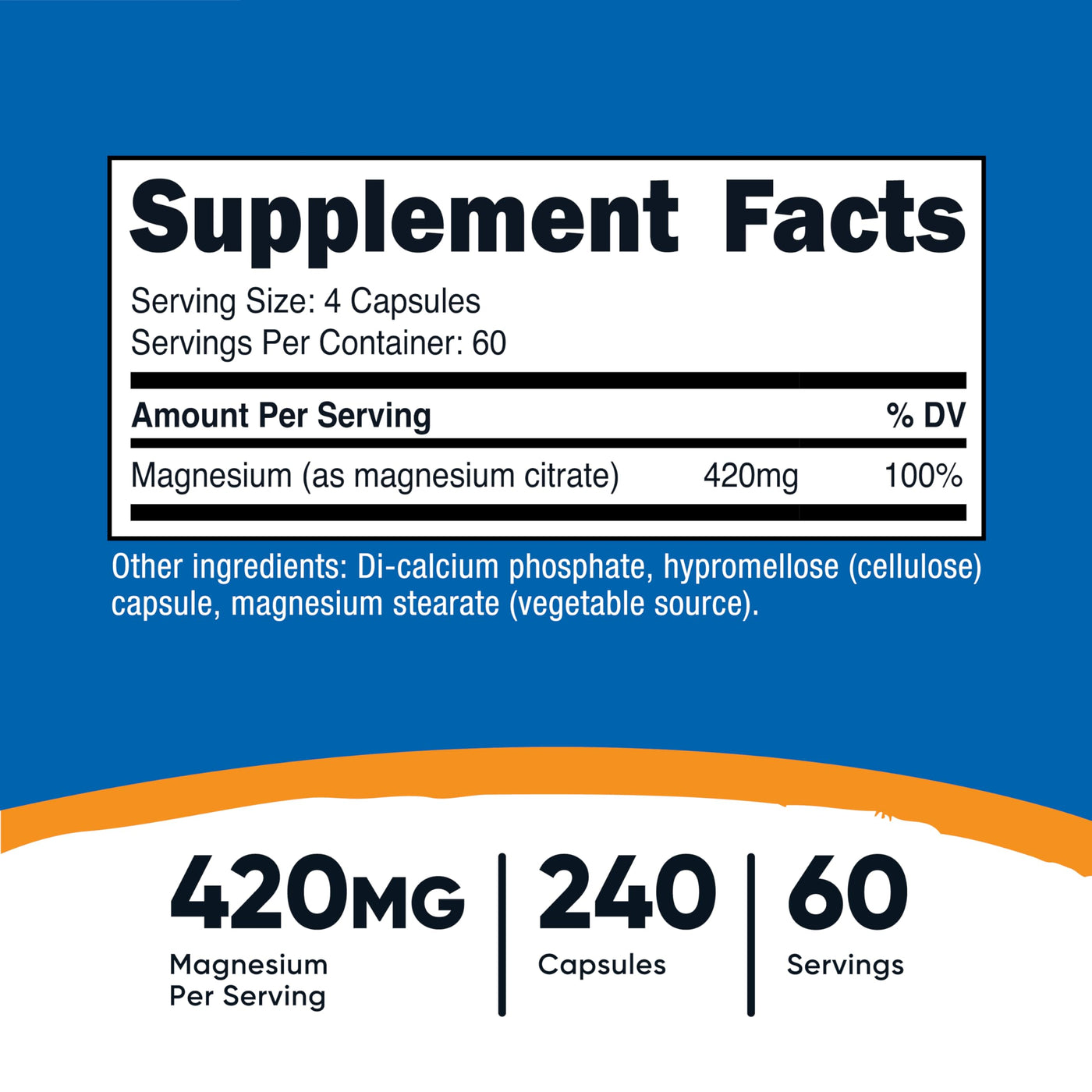 Nutricost Magnesium Citrate 420mg, 240 Veggie Capsules - 60 Servings, Gluten Free, Non-GMO, Vegetarian Friendly 240 Count (Pack of 1)