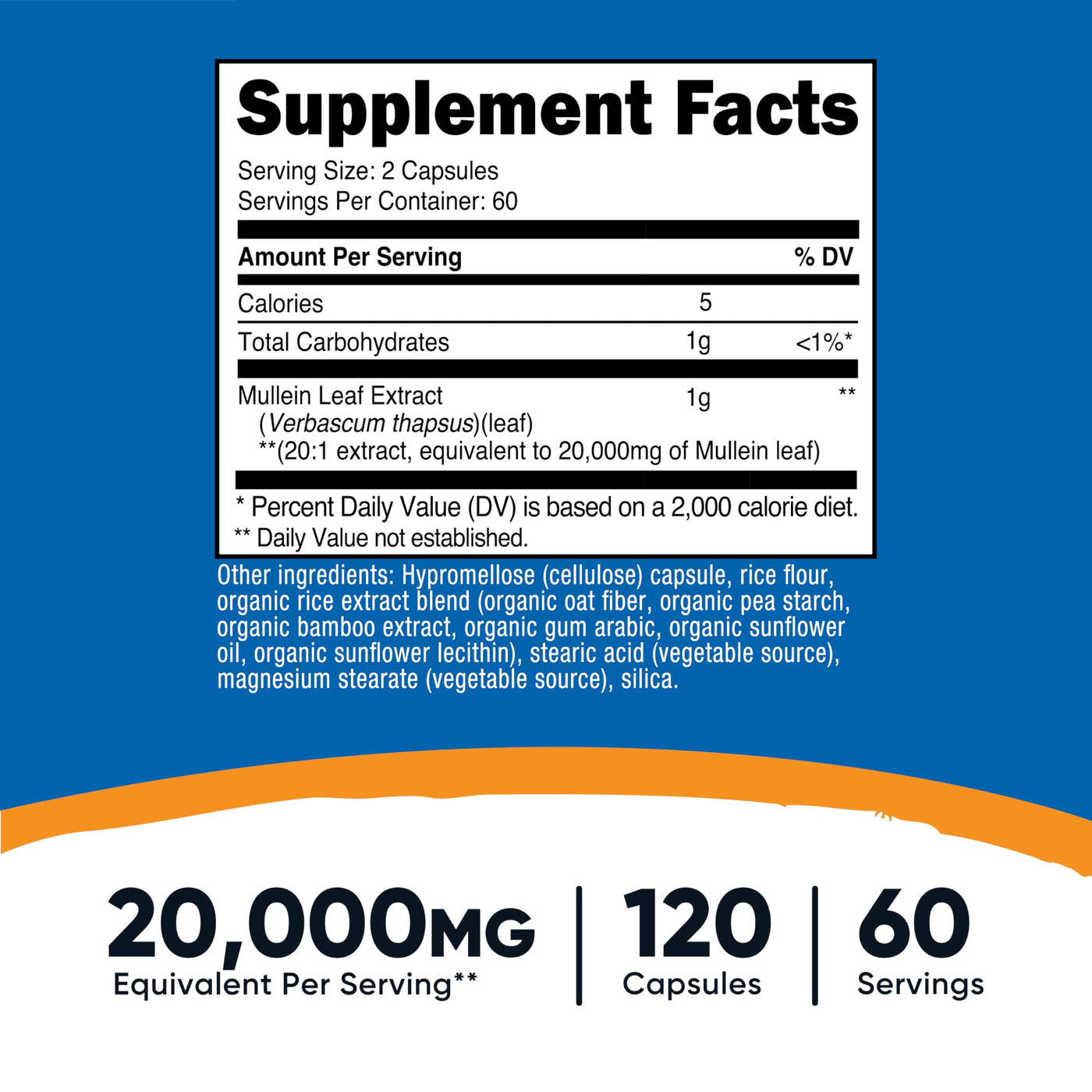 - Provides 1 mg of mullein leaf extract at a 20:1 concentrationequivalent to 20,000 mg of mullein leaf per serving