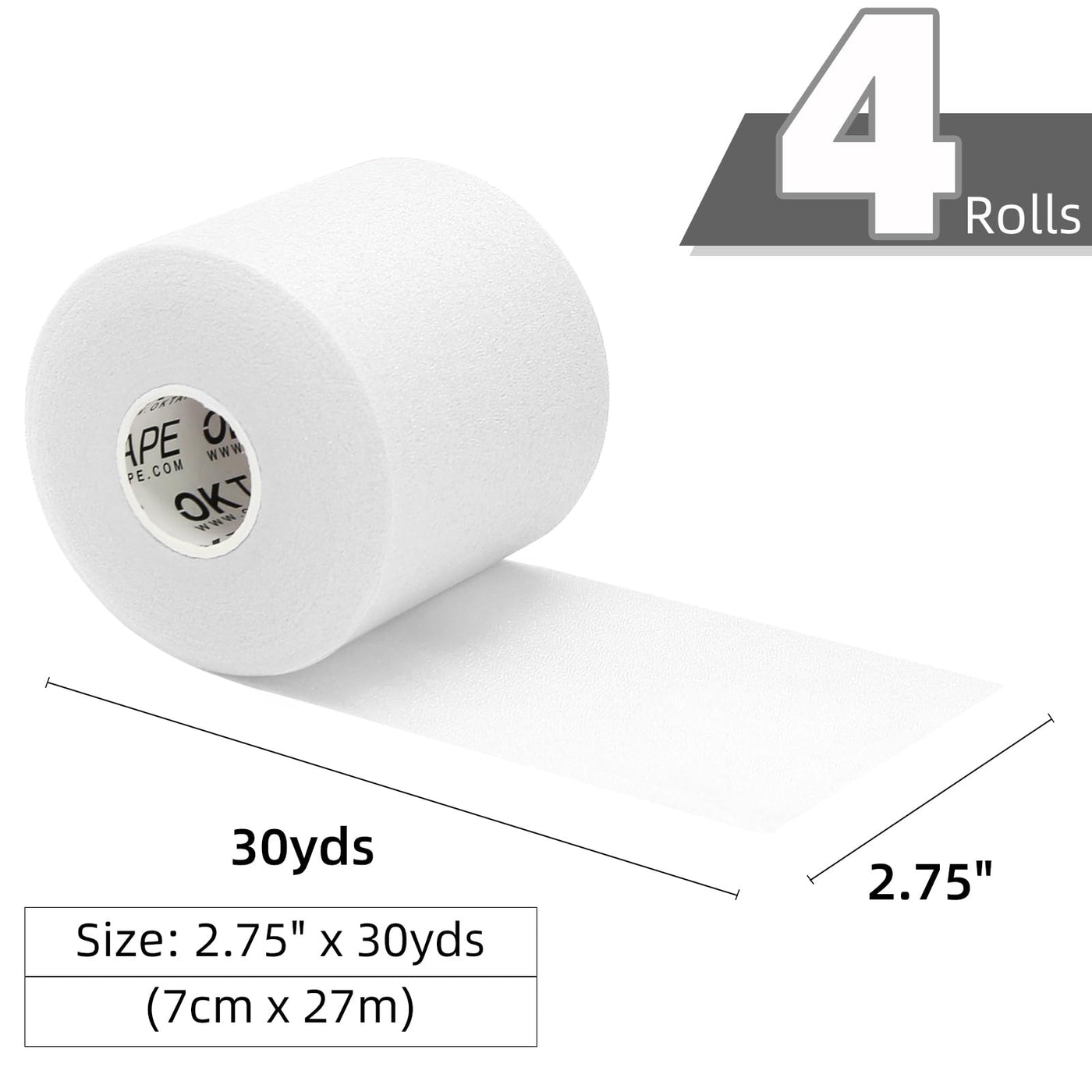 - 4 ROLLS PREWRAP ATHLETIC TAPES - OK TAPE foam pre wrap tape is 30 yards long and 2.75 inches wide per roll. 4 rolls are perfectly suited for your sports and daily use.