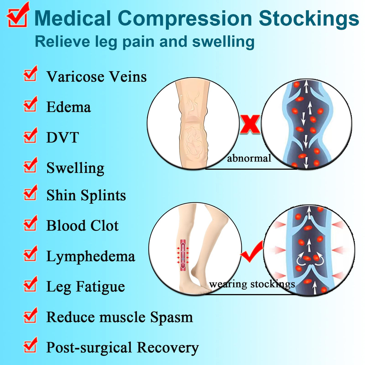 - MEDICAL EFFECT OF THE 20-30 mmHg COMPRESSION STOCKINGS:By massages and energizes tired to improving blood flowing.treatment to maintain normal circulation and blood flow.Relieves numb aching in ankle legs and feet. achy legs and helps prevent and treat: fatigue,pain,stiffness,soreness,swelling, cramps,shin splints,varicose veins,lymphedema, phlebitis,deep vein thrombosis, blood clots.
