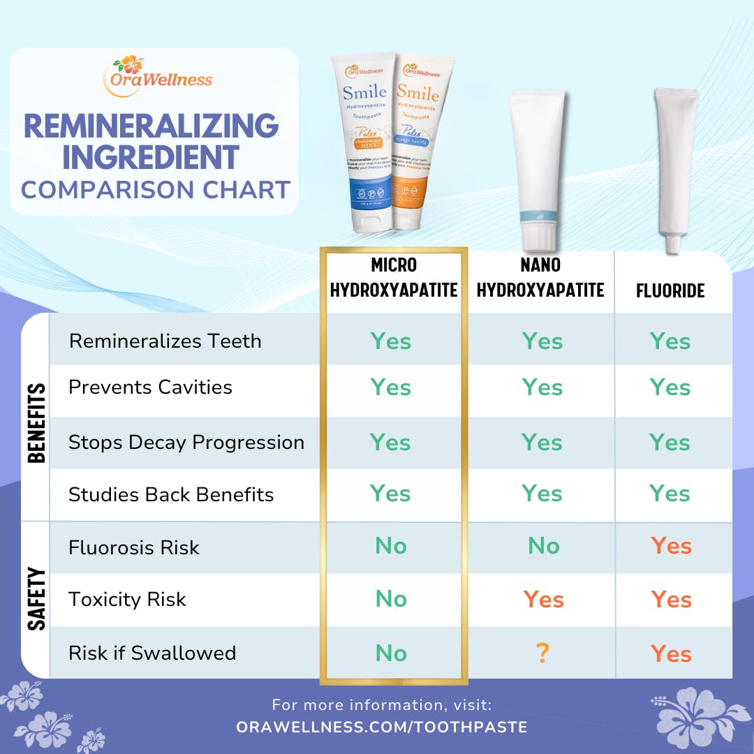 Strengthen your smile the natural way with our Orawellness Smile Toothpaste, a hydroxyapatite toothpaste designed to remineralize, restore, and protect, without harsh chemicals or synthetic ingredients. Powered by non nano- hydroxyapatite, a mineral that mimics the natural structure of your teeth, this toothpaste helps rebuild enamel, reduce sensitivity, and even reverse early-stage tooth decay with consistent use. Formulated for total mouth wellness, this clean, science-backed toothpaste supports a balanced oral microbiome. Non nano-hydroxyapatite toothpaste is essential for healthy gums, strong enamel, and long-term cavity prevention. The bold, refreshing blend of cinnamon and mint provides a naturally clean feeling and freshens breath with every brush. Made for daily use and safe for the whole family, our non-toxic, fluoride-free toothpaste is free from SLS, artificial sweeteners, and preservatives. It’s gentle on enamel, kind to your gums, and tough on plaque: everything you want in an oral care essential.