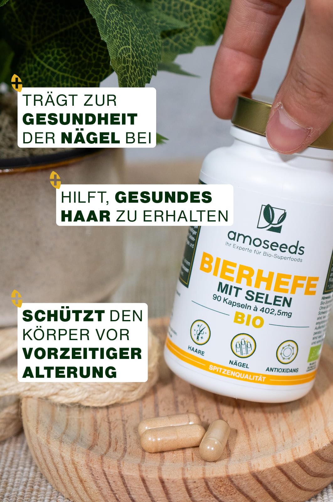 - LONG & SHINY HAIR: Brewer's yeast is known for its positive effects on hair health. To further enhance their effectiveness, our organic brewer's yeast active capsules are enriched with selenium, which has antioxidant properties. In this way you protect your hair from harmful environmental influences and help maintain its health.