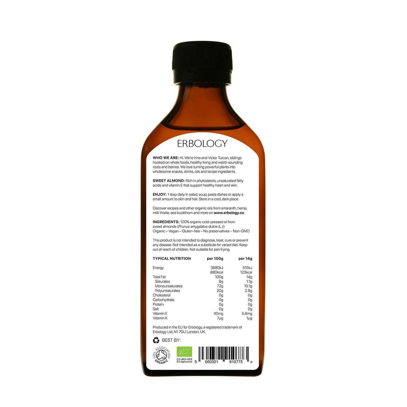 Erbology Organic Cold-Pressed Sweet Almond Oil nourishes your body and skin with healthy fats, vitamins, and phytonutrients. Enjoy its light nutty flavour in sweet and savoury dishes. The Sweet almond oil appeared in Ayurvedic, Ancient Chinese and Greco-Persian medicine. Today, it is enjoyed in cuisine or applied directly onto the skin and hair for deep nourishment. Sweet almond oil nurtures with its phytosterols, unsaturated fatty acids, vitamin E and vitamin A. As a result, it can fight free radical damage. Free radicals can cause overall ill health as well as weakening of the collagen of the skin. Ingredients 100% organic cold-pressed oil from sweet almonds (Prunus amygdalus dulcis (L.)) P.when('A').execute(function(A) { A.on('a:expander:toggle_description:toggle:collapse', function(data) { window.scroll(0, data.expander.$expander[0].offsetTop-100); }); }); Directions Enjoy 1 tbsp daily in salad, soup, pasta dishes or apply a small amount to skin and hair. Manufacturer Contact Information Erbology Ltd, N1 7GU, London, UK. See more