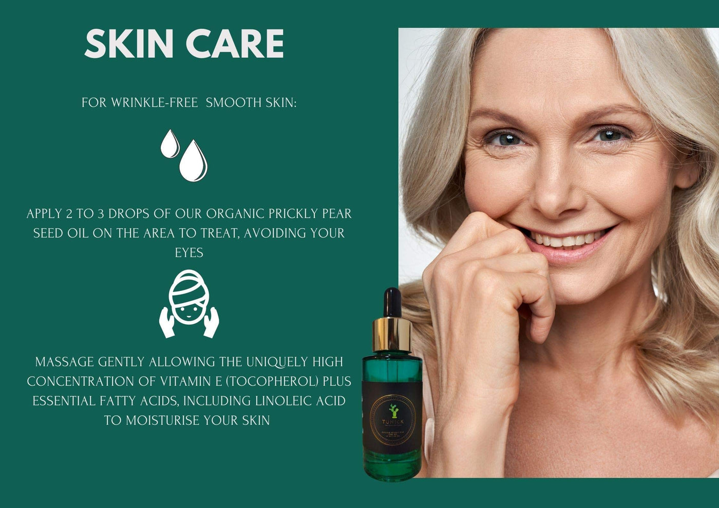 - Rich in vitamin E, TUNICK prickly pear oil is a powerful skin-firming agent. Its rich concentration of omega 6 regenerates skin cells.