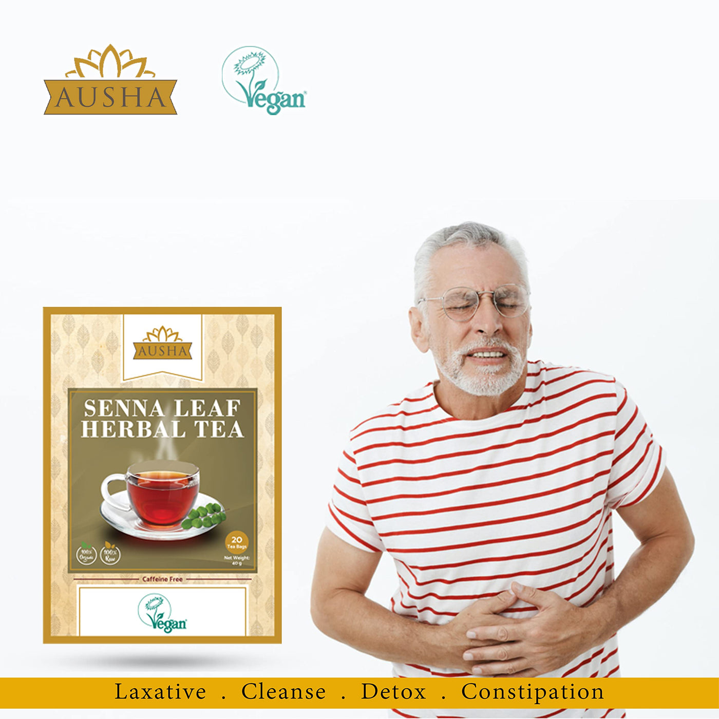 - Certification - Ausha Organic Senna Tea is tested for pesticides & Heavy Metals. Organic Certified by Soil Association & Vegan certified by the Vegan Society in the UK.No Additives added.