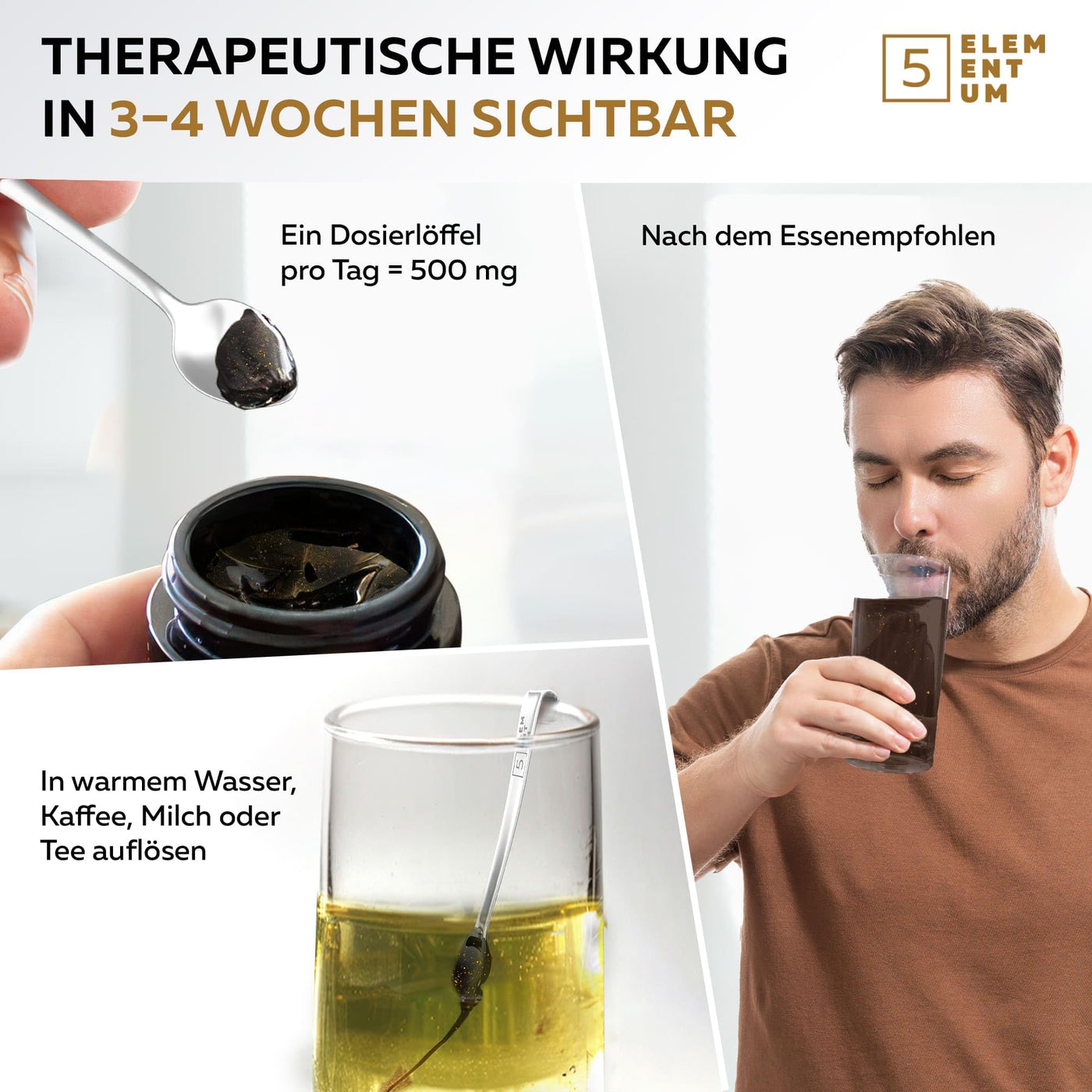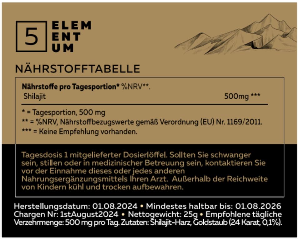 Product Description READY TO USE - Each authentic pure Shilajit is soft and sticky when warm and hardens when cool. Out of For this reason, it may be difficult to receive a dose at first. Warm up Before use, carefully place the container in a bowl of hot water. Take 500mg out with the measuring spoon and dissolve it in warm water or Herbal tea valued by athletes, Ayurveda healers and business people. The 5 Elementum Shilajit is the original Himalayan you can buy. It is not just a product, it is a gift of nature, carefully made by hand collected and processed to bring you the best of Himalayan organic nature offer. It is pure Shilajit, without additives or preservatives. HOW TO ENJOY: Shilajit has a taste that takes some getting used to and is not something for everyone. Can be taken daily, morning or evening. Use the small spoon to measure the desired dose of Shilajit resin. Give it in a cup of warm water, tea or coffee to dissolve as an elixir. Storage: Store in a cool, dark place or after opening Store in the refrigerator. Do not freeze. The 5 Elementum Shilajit is more More than just a product, it's a lifestyle. It's for those who do Want the best, value quality and want to use the benefits of nature. Order the 5 Elementum Shilajit now and experience the wonders of the Himalayas Nature. shilajit original,mumijo shilajit original himalaya,shilajit,himalayan shilajit,mumijo gold,natural shilajit,pure himalayan shilajit,pure shilajit original, shilajit himalaya natural, shilajit resin, shilajit effect, premium shilajit, pure shilajit, shilajit resin, shilajit himalaya, shilajit himalaya, shilajit high dose Warnings Not for people under 18 years old. Do not exceed the specified recommended daily dose. Dietary supplements should not be a balanced diet substitute. If you are pregnant or taking medication Ingredients/ Ingredients Pure Shilajit 24K Gold P.when('A').execute(function(A) { A.on('a:expander:toggle_description:toggle:collapse', function(data) { window.scroll(0, data.expander.$expander[0].offsetTop-100); }); }); Warnings Keep out of the reach of children in a cool and dry place store. Keep out of reach of children. More