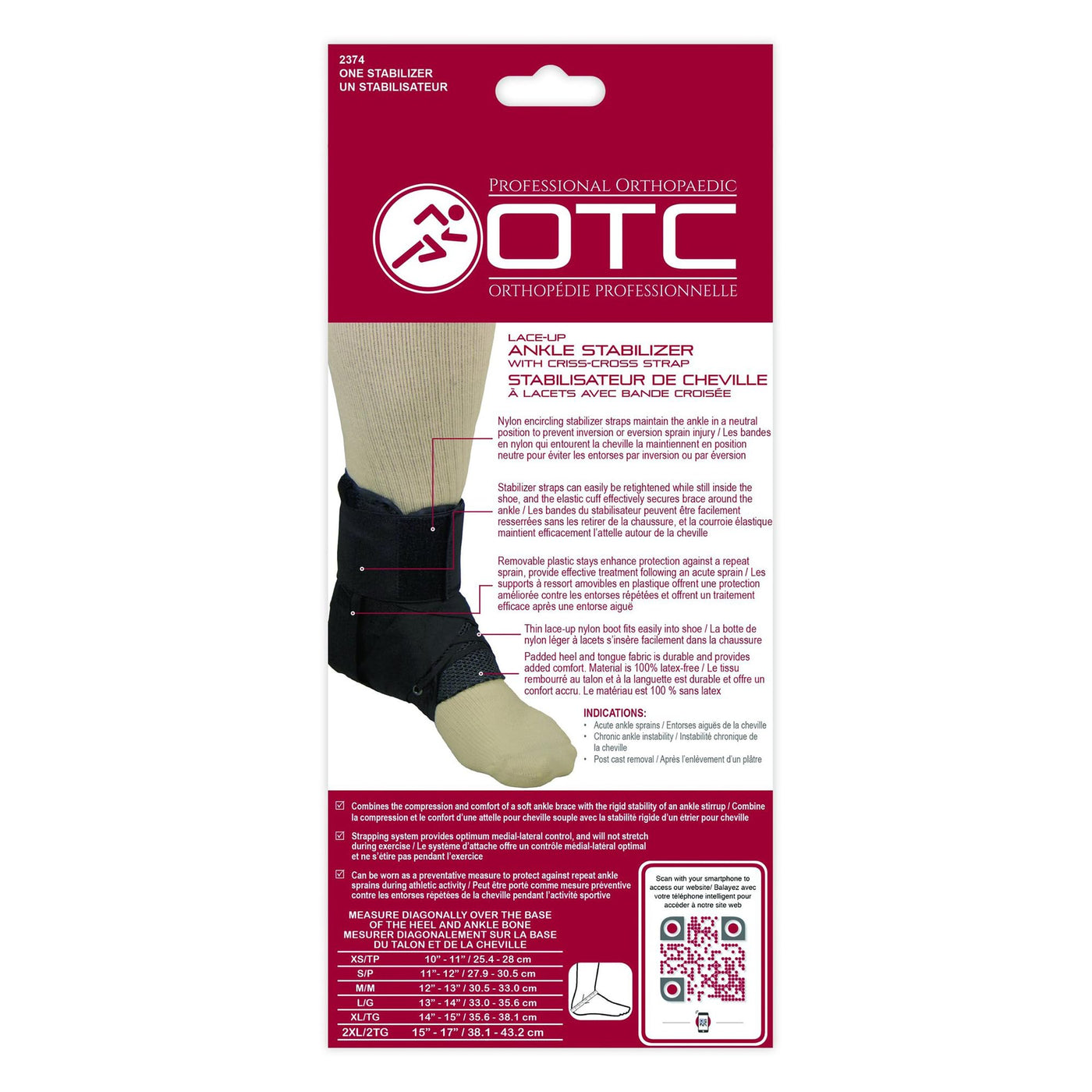 The OTC -UP ANKLE STABILIZER WITH CRISS-CROSS STRAP provides excellent support for severe strains, sprains or post-fracture treatment. Fully adjustable strapping system provides optimum medial-lateral control, and will not stretch during activity. Durable, lightweight materials allow full range of motion in the foot and ankle. Fits easily inside shoe. Can be worn as a preventative measure to protect against repeat ankle sprains during athletic activity. Nylon encircling stabilizer straps maintain the ankle in a neutral position to prevent inversion or eversion sprain injury. Stabilizer straps can easily be retightened while still inside the shoe, and the elastic cuff effectively secures brace around the ankle. Thin lace-up nylon boot fits easily into shoe. Removable plastic stays enhance protection against a repeat sprain, provide effective treatment following an acute sprain. Padded heel and tongue fabric is durable and provides added comfort. Material is 100% latex-free. INDICATIONS FOR USE: Acute ankle sprains, Chronic ankle instability, Post cast removal. Refer to Sizing and Measuring Chart to ensure a proper fit.