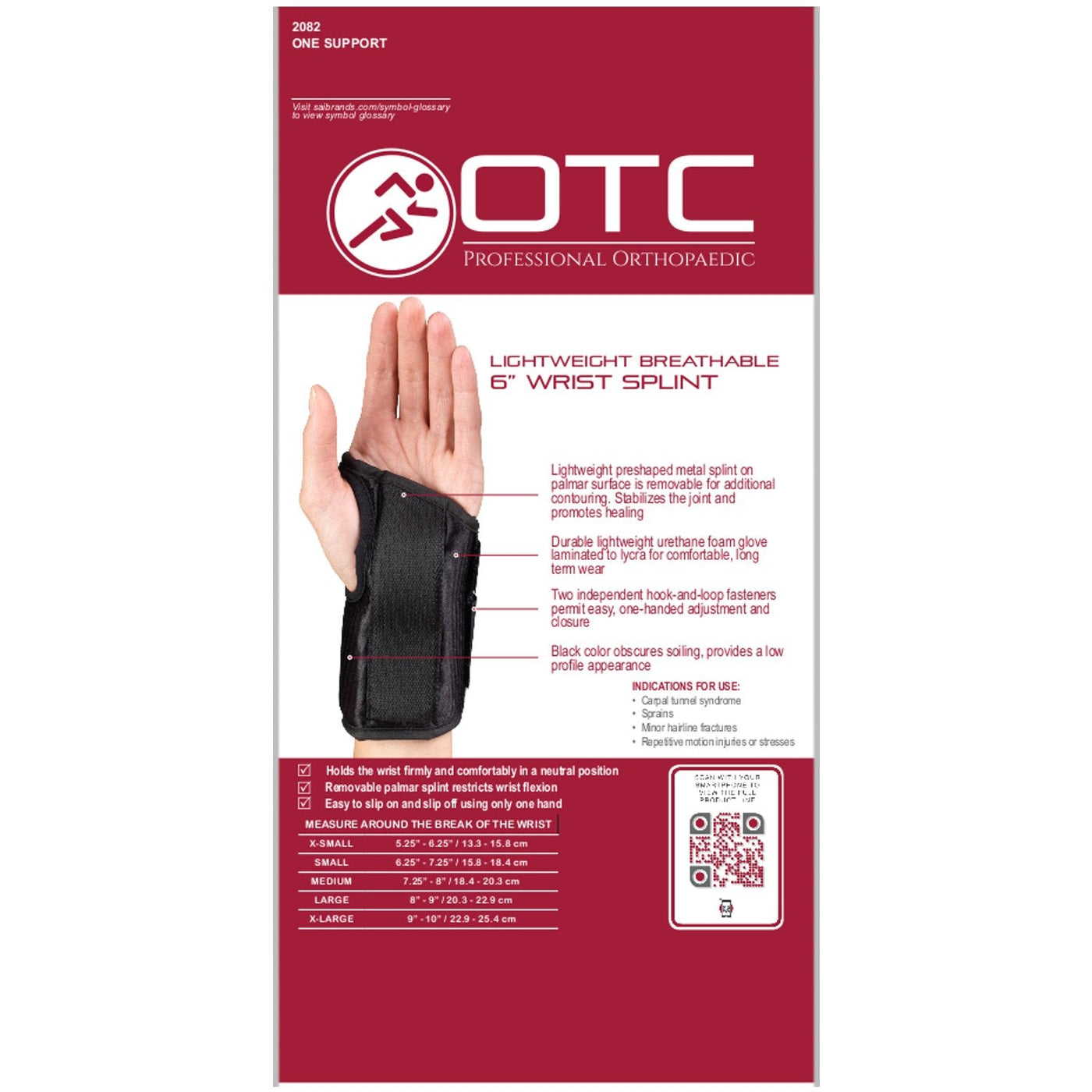 OTC brand (model 2082) six-inch length wrist splint. Features a low profile contour at the palmar crease to allow for full finger dexterity. The lightweight laminated foam glove with separate hook and pile cinch fasteners provides support and compression to the wrist to help relieve swelling and minimize pain. The preshaped metal splint prevents painful wrist flexion, and holds the wrist in a neutral position to promote healing. Perfect for latex sensitive wearers. Available for the left hand (model 2082/L) or right hand (model 2082/R). Manufacturer Contact Information SAI, CINCINNATI, OH, 45209 US