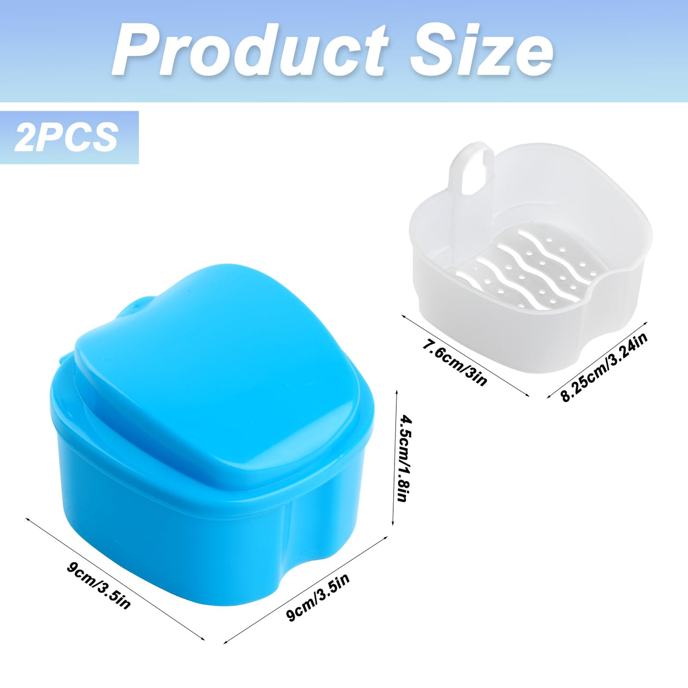 What are the advantages of our denture cleaner can? π The can of dental splints is made of high quality PP material. The edges and surface are smooth and burr-free. It is strong, cannot be easily damaged or deformed and is long lasting. π Each denture box comes with one Removable filter soaking basket supplied so you can use it overnight Soak and filter and dry easily. π Small and light, simple to transport and use when going out to avoid accidental damage of the prosthesis. π Suitable for dentures, retainers, mouth guards, Braces, orthodontic appliances, pacifiers, etc. Features: Material: PP Color: Blue Size: As shown Package includes: 2 pieces - Denture Boxes Customer Service Guarantee: If you have any questions, please contact Please contact us in time and we will solve your questions as soon as possible. Warm Tips: The dimensions are measured manually, please allow minor errors. Due to the color settings of your monitor, the Color may vary slightly from online image. Please refer to that actual product. Thank you for your understanding.