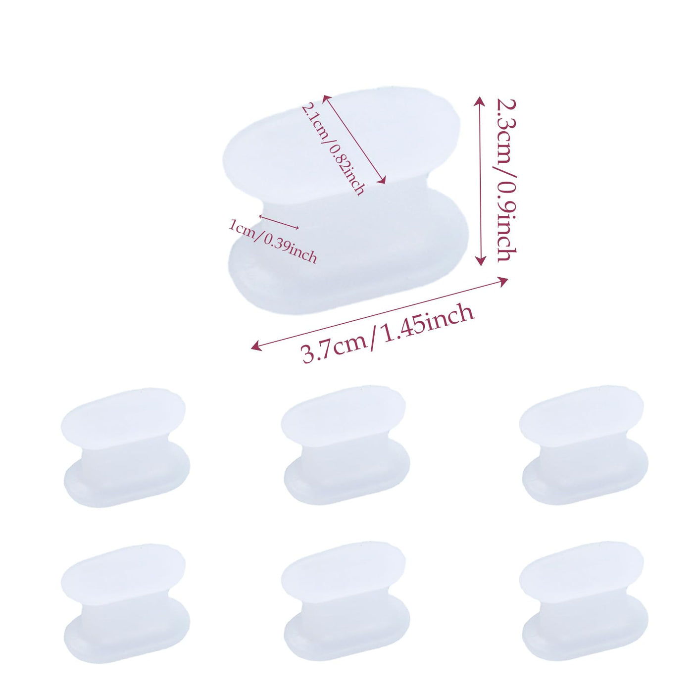 HoaaiGo Gel Toe Separator - 6 Pack Infused Silicone Toe Separator, Bunion pads for straightening overlapping toes, bunions, calluses - Bunion Corrector for Men and Women Material: Soft, durable and flexible silicone gel Suitable for: men and women. Scope of delivery: 6 gel Toe separators. Product size: height 2.3cm length 3.7 thickness 1cm features Toe Separators: 1. The toe cushions for pain relief can help Relieve pain and discomfort caused by calluses, bunions, blisters. 2. They reduce calluses and hard skin that result from a bunion. 3. They are washable and reusable. 4. Medical gel/silicone, a soft material that is gentle on the skin but also very durable. The Gel is enriched with aloe vera extract. 5. Bunion pads with separator Place the big toe in the correct position, prevent the big toe moved inwards, towards the other toes. Toe separator is here to help you with a variety of issues including overlapping toes, hammer toes, bunions, toenail fungus, blisters, corn, cracked Heels, Plantar Fasciitis, Trigger Finger and Other Health Issues! Warning: 1. Keep away from children to avoid various dangerous situations like avoiding swallowing. This is not a toy. 2. They are washable and reusable. Please use warm water to wash them. Air dry or wipe dry. 3. Do not touch the wound directly. If allergic, please stop use and consult your Physician. 4. After washing and drying in warm water with talcum powder or Sprinkle baby powder. Wipe off the excess talcum powder or baby powder before wearing. Use talcum powder and baby powder to prevent that the silicone sticks together, which is uncomfortable to wear. 5. Not for Suitable for severe bunions. If your toes are crossed, help you this little protector doesn't. Please consult your doctor.