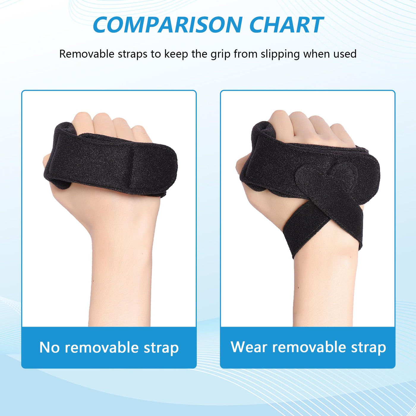 - ADJUSTABLE & ANTI-SLIP DESIGNTwo adjustable strong hook&loop straps can be adjusted according to the needs of the comfortable palm position. One of the elastic straps is detachable; attach the Velcro on one end to the palm protector, then wrap the strap around the wrist and attach the Velcro on the other end to the palm protector to prevent the palm protector from slipping off.