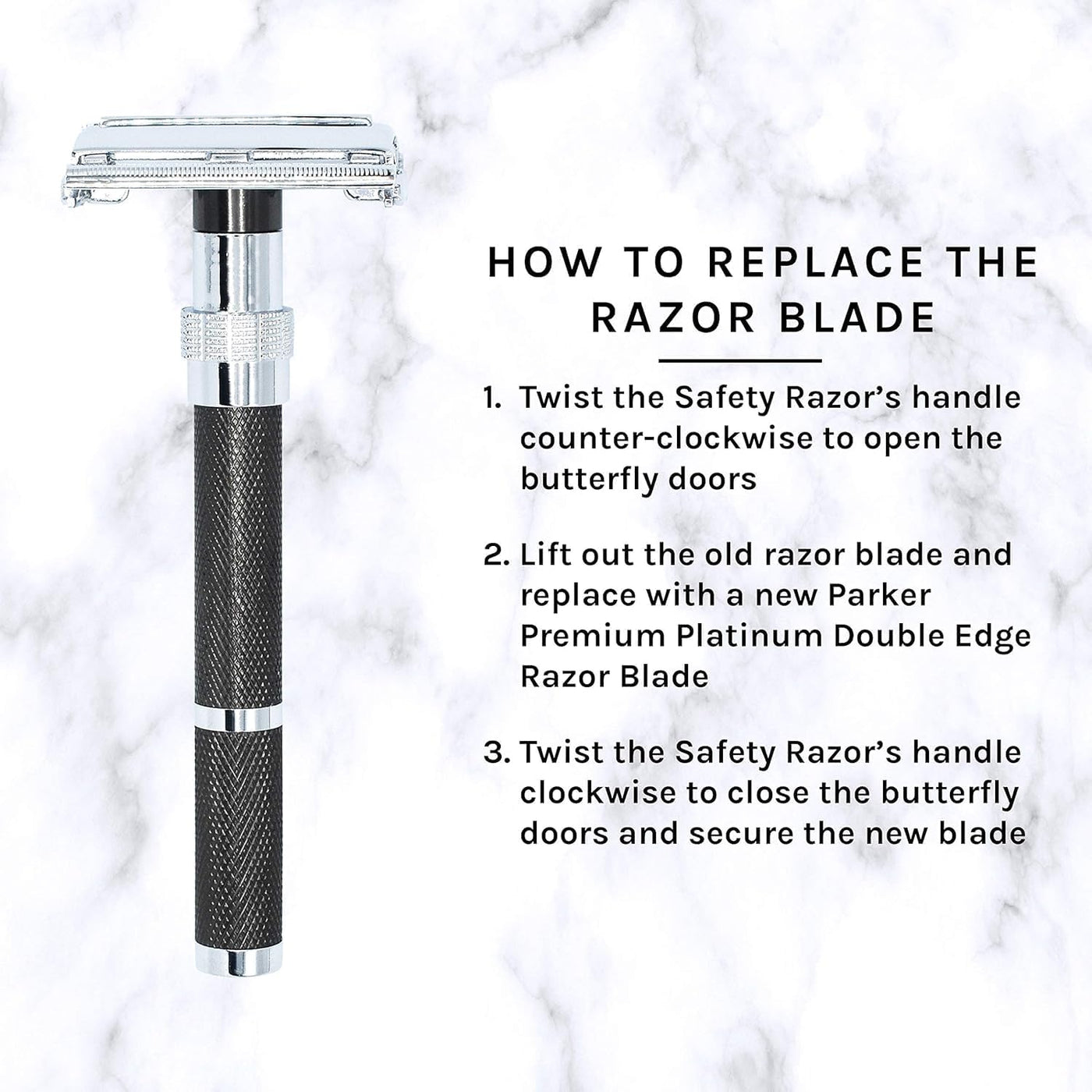 - TWIST-TO-OPEN BUTTERFLY HEAD The user-friendly butterfly opening mechanism makes blade replacement fast, easy, and safe. Simply twist the handle base to open the razor head, insert a double edge blade, and twist closed. A perfect choice for beginners, daily shavers, or professionals who need a reliable, time-saving razor.
