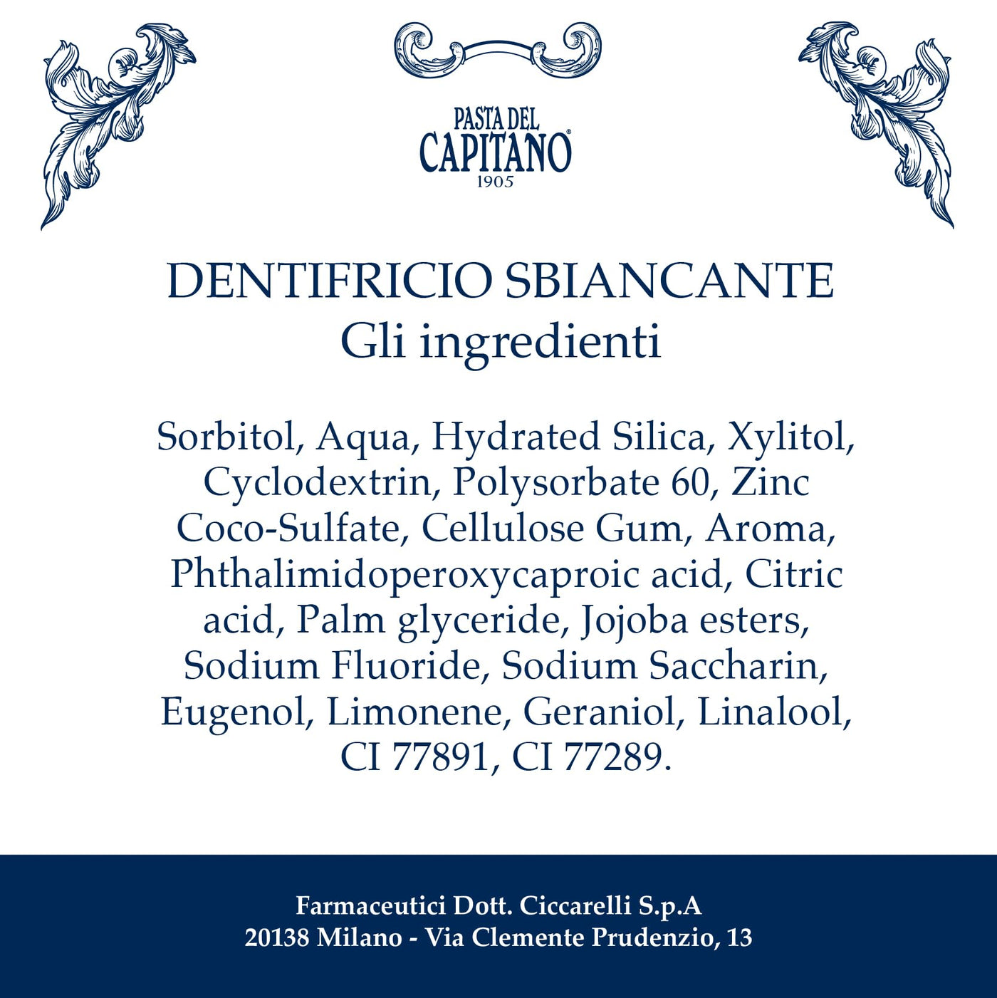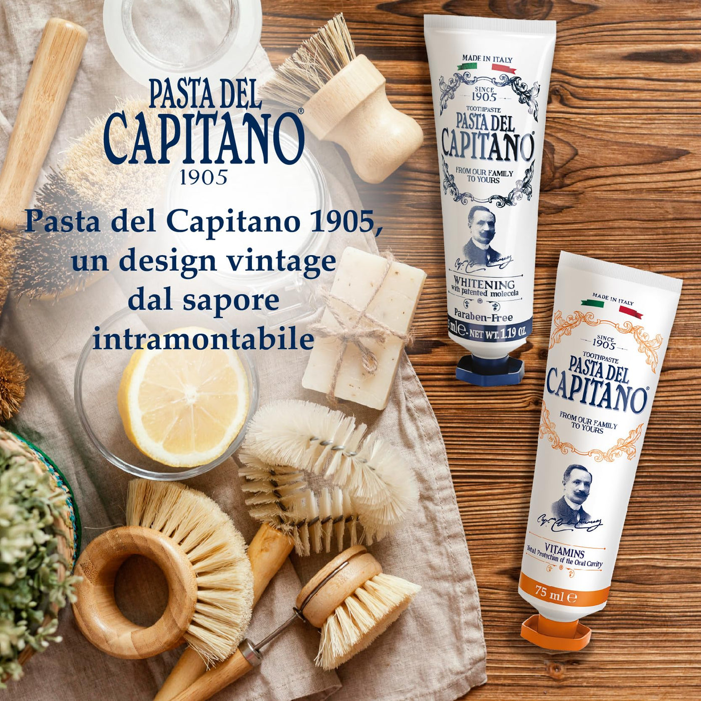 Launched in 1905, Pasta del Capitano was the first toothpaste to launch in Italy. Gentle and effective, this paraben-free whitenig toothpaste contains the patented molecule EURECO H.C.which releases Active Oxygen with a strong whitening action. It removes 99% of bacteria right from the first use, without affecting gums and enamel. Pasta del Capitano 1905 is a complete line of products for oral hygiene, with formulations that pay particular attention to safety. They contain Sulfetal ZN ®, a patented and exclusive molecule based on Zinc. This innovative solution has allowed for the elimination of Sodium Lauryl Sulfate, triclosan, parabens and formaldehyde donor preservatives.