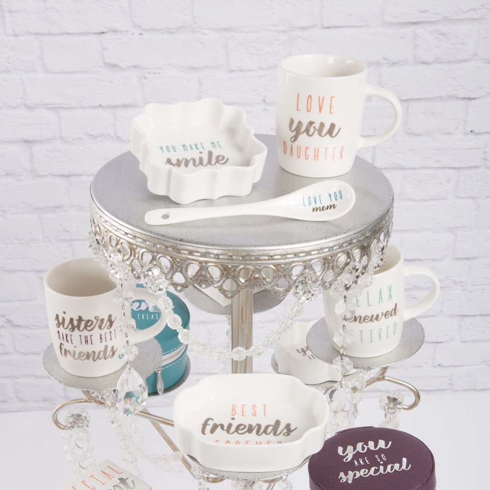 Best Kept Trinkets are the perfect tiny treasure for those special people in your life. Items feature sweet sentiment and are functional. Simple color palette with metallic accents. Features bone china jewelry dishes, mini 5 oz mugs, mini spoons along with mini mdf jewelry boxes and mini jewelry storage zip up cases. Some items come with beautiful gift ready packaging. From best friends, daughters, aunts, moms, nurses, grandmas, teachers and nanas to general sentiments like retired, love you, enjoy the little things, you make me smile and more.