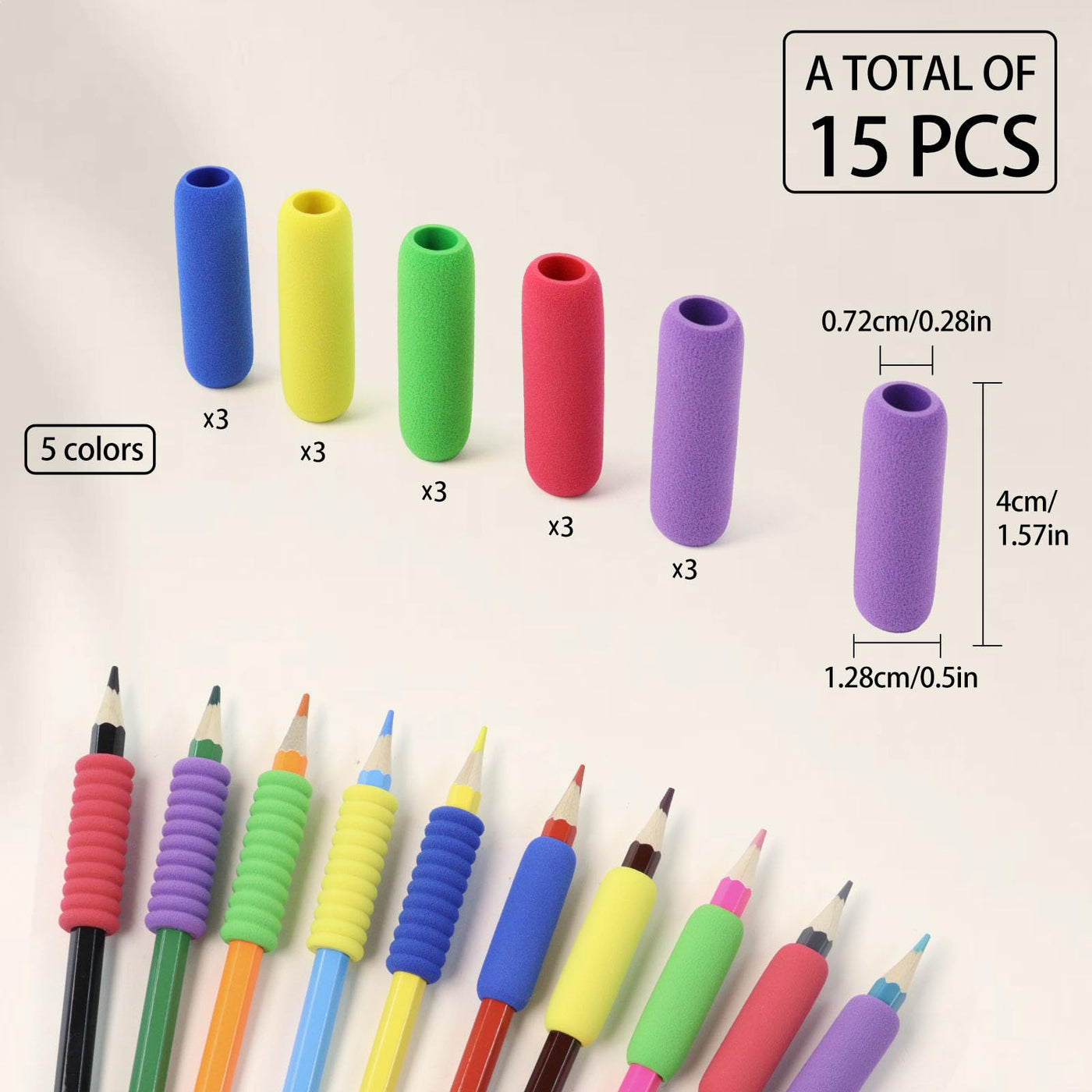 - Sufficient Quantity: Each set of products contains 15 pencil grips in 5 bright colors (3 of each color), which are sufficient to fully meet daily writing, painting and office needs. Whether you use it at home, in the office, or in school, you can easily find your favorite color and match it with pencils and pens to enhance the writing experience.