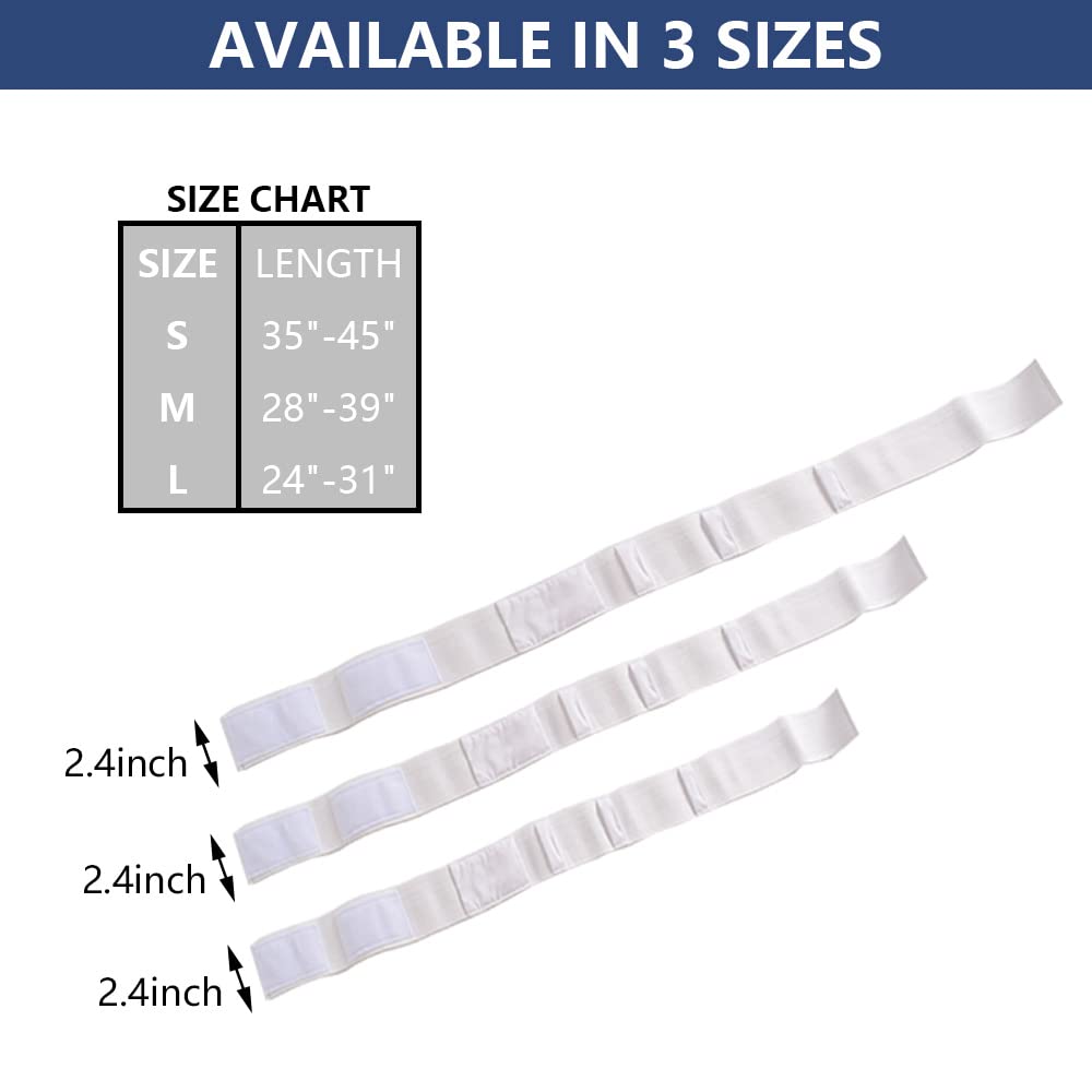 - SIZE: The belt is available in 3 practical sizes. To measure around the stomach a few centimeters above the exit point: Small: 24-31 (60-80 cm), Medium: 28-39 (70-100 cm), Large: 35-45 (90-115 cm).