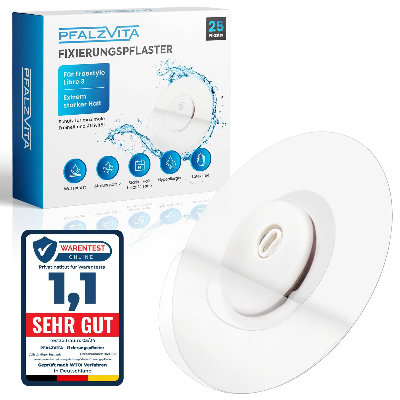 PFALZVITA® Freestyle Libre 3 plasters - 25 premium waterproof fixing plasters for Freestyle Libre 3 Sensor - skin-friendly, self-adhesive, extra hold for 14 days without glue in the middle (transparency)