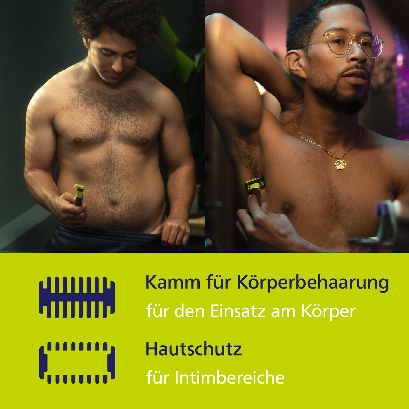 - Long hair trimmer for body hair and razor: Trim and shave body hair in any direction with the attachable comb attachment (3 mm) and the skin guard for an additional layer of protection in sensitive areas