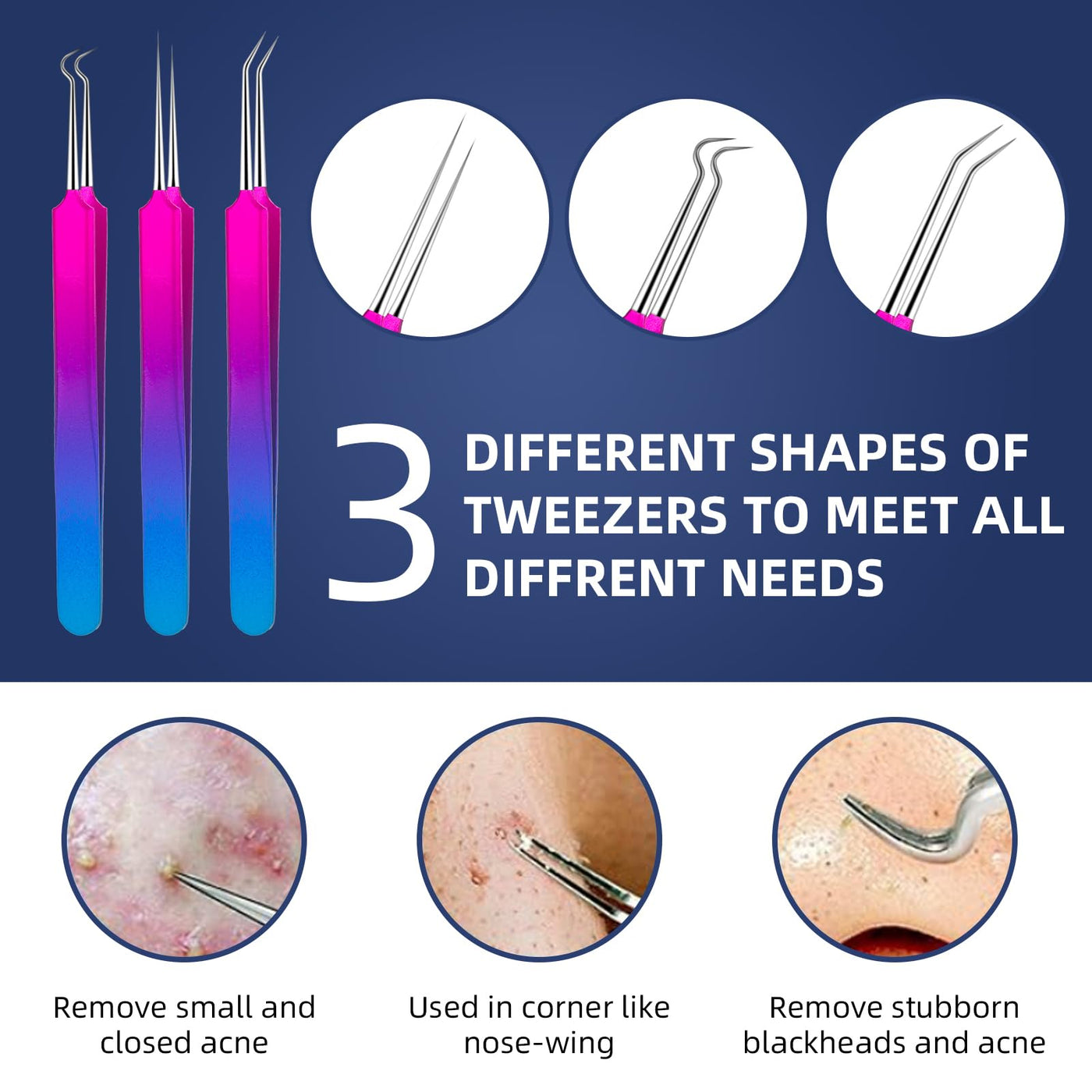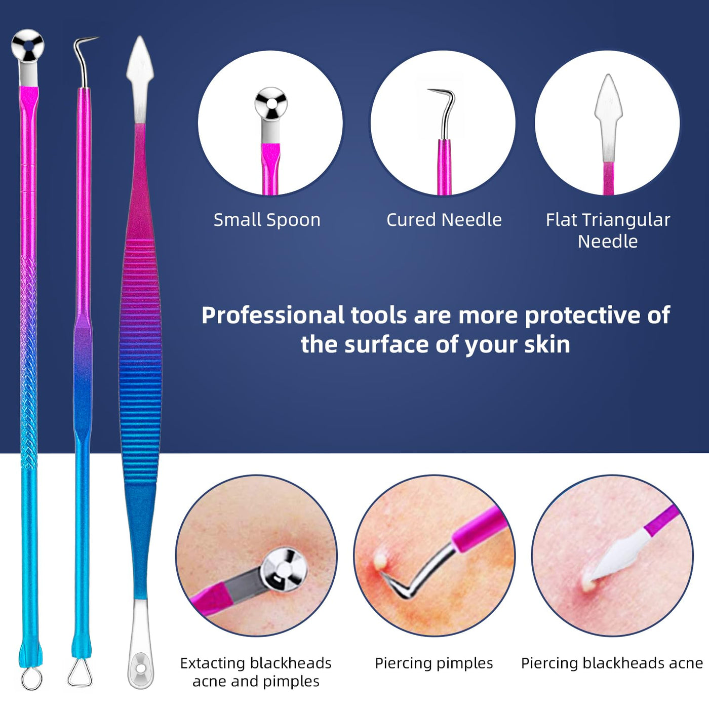 - Pimple Popper Tool Kit: Totally 10 tools with double use ends, included tin carrying case keeps tools safe, clean, and conveniently packed for transport or storage, manage pesky breakouts. (Note: Blackhead Remover Tool Set include a 12-month quality assurance. Customer' complete satisfaction is our No.1 priority).