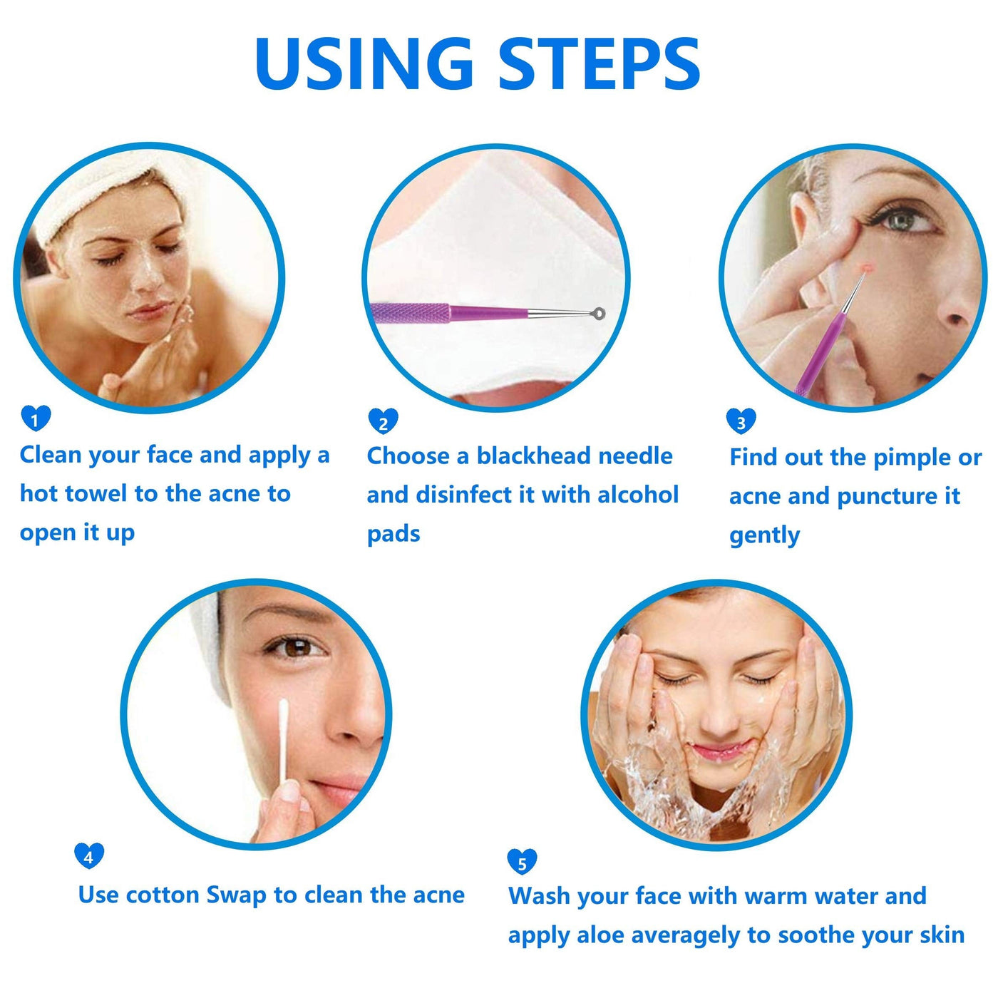 - No scarring: A cleaner and more hygienic way than your fingers to remove impurities like blackheads, acne and various blemishes, keep your face clean and smooth without redness or scar. Follow our easy instructions: (please choose the MATURED acne pore, otherwise it will get worse) firstly hold the warm cloth to the area to open up the pores, then use alchol to wipe your pore area and the tools before/during and after, lastly apply toner to your skin.