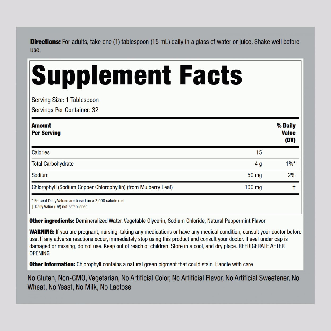Why eat your greens when you can drink them! Our liquid chlorophyll boasts a nutritional profile that makes daily intake easier than ever. Chlorophyll is the green pigment produced by plants as a result of them undergoing photosynthesis. It is also known to contain many naturally-occurring vitamins and minerals. With 100 mg per serving, this fat soluble nutrient brings a host of good things to your system. Grab a bottle and start living the plant life today!Piping Rock's PromisePiping Rock proudly offers an ever-growing selection of products designed to help you achieve your unique wellness goals. We verify all products with third-party, FDA-registered agencies ensuring purity, potency, safety, and innovation in everything we do. We’re committed to supporting you in your journey to healthy living, and we thank you for choosing us!