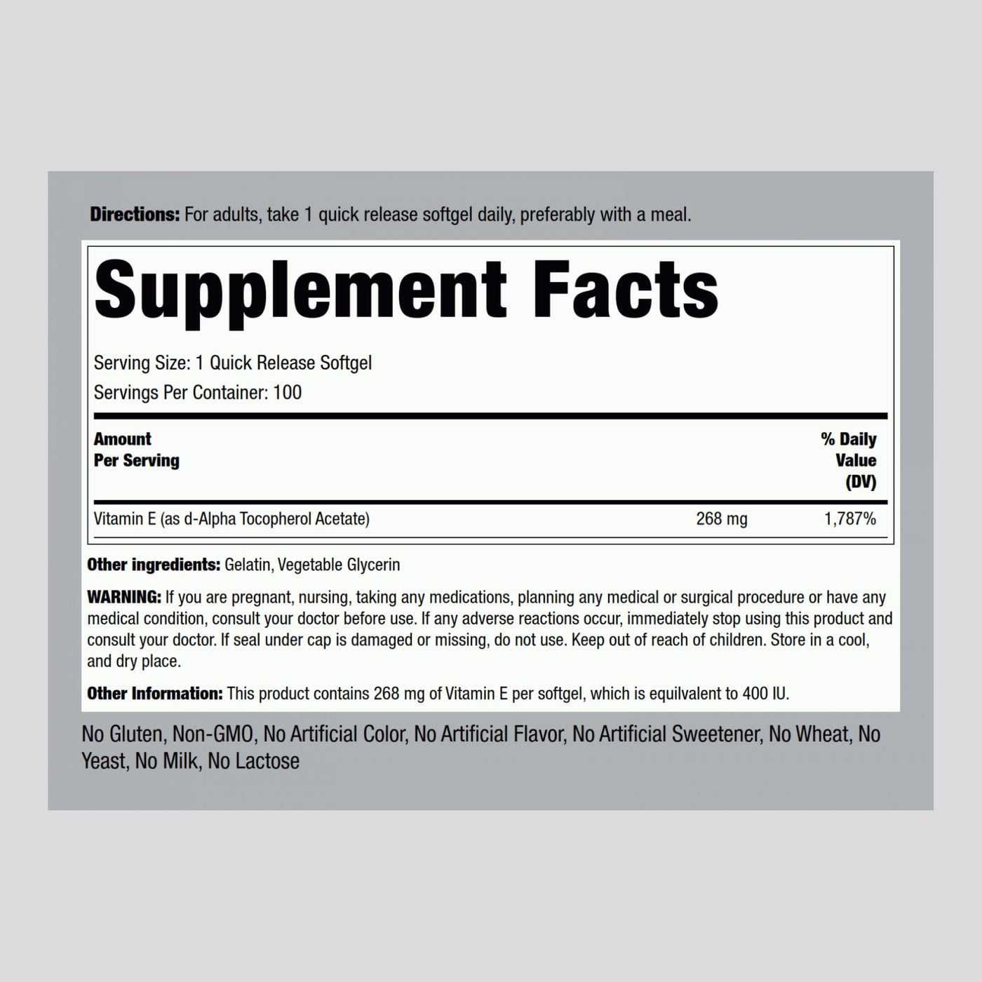 Piping Rock Vitamin E 400 IU Softgels | 268mg | 100 Softgel Capsules | D-Alpha Tocopherol | Non-GMO, Gluten Free Supplement 100 Count (Pack of 1)