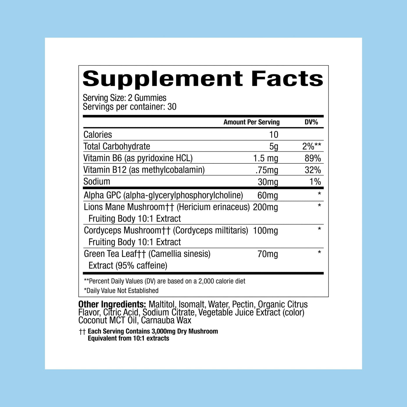- Sugar-free super mushroom gummies Our nootropic brain support is vegan & gluten-free. Each gummy has a citrus flavor. These focus gummies are non-GMO and lab-tested, free from food dyes, sugar alcohols, gelatin, and HFCS. Enjoy 2 daily for focus or a tasty treat!