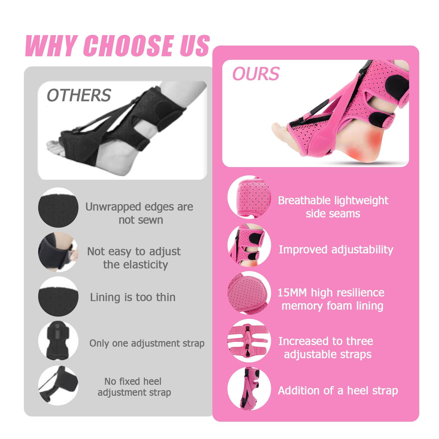 - [Adjustable Fit for Everyone] Featuring three adjustable elastic straps and special dorsiflexion strap, our plantar fasciitis splint accommodates various foot sizes and shapes, making it the perfect night splint for both men and women. Customize your fit for optimal support and comfort.