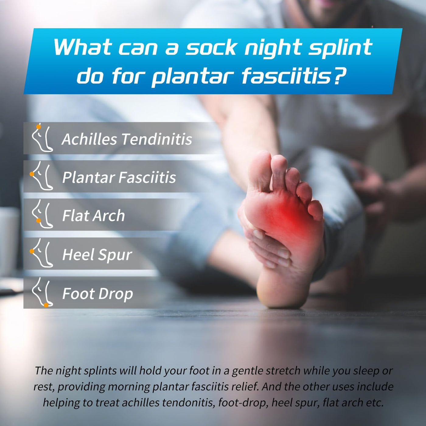 - What can a sock night splint do for plantar fasciitis? - Sock night splints are drug-free and noninvasive, making them one of the most effective conservative treatments for plantar fasciitis. The night splints will hold your foot in a gentle stretch while you sleep, rest, or even watch tv, and it holds your foot in a stretched position, providing morning plantar fasciitis relief. And the other uses include helping to treat achilles tendonitis, foot-drop, heel spur, flat arch etc.
