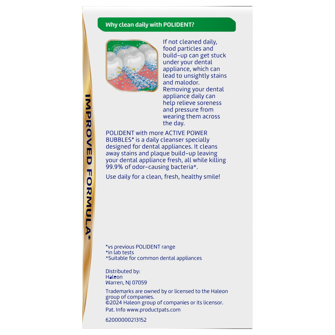 Introducing an improved formula (1) from Polident, the 1 Dentist Recommended Dental Appliance Cleansing Brand, now with more active power bubbles (1) for an amazingly clean dental appliance every day! Polident Smokers Antibacterial Dental Appliance Cleanser effectively cleans tough stains like coffee, tea, and tobacco with a specially designed formula for dental appliances, including full dentures, partial dentures, retainers, aligners, and mouthguards (3). Offering a 360-degree deep clean (4), the active power bubbles in Polident Dental Appliance cleansers actively clean even the hardest to reach places (2) and keep your dental appliance fresher for longer (5). No time? No problem! Polident cleanser tablets are easy to use – just soak for 15 minutes, brush, rinse and go! Use daily as directed for the best clean and a clean, fresh, healthy smile. (1) Vs. previous Polident range (2) In laboratory tests (3) Suitable for common dental appliances (4) When used as directed (5) Vs. no tablet
