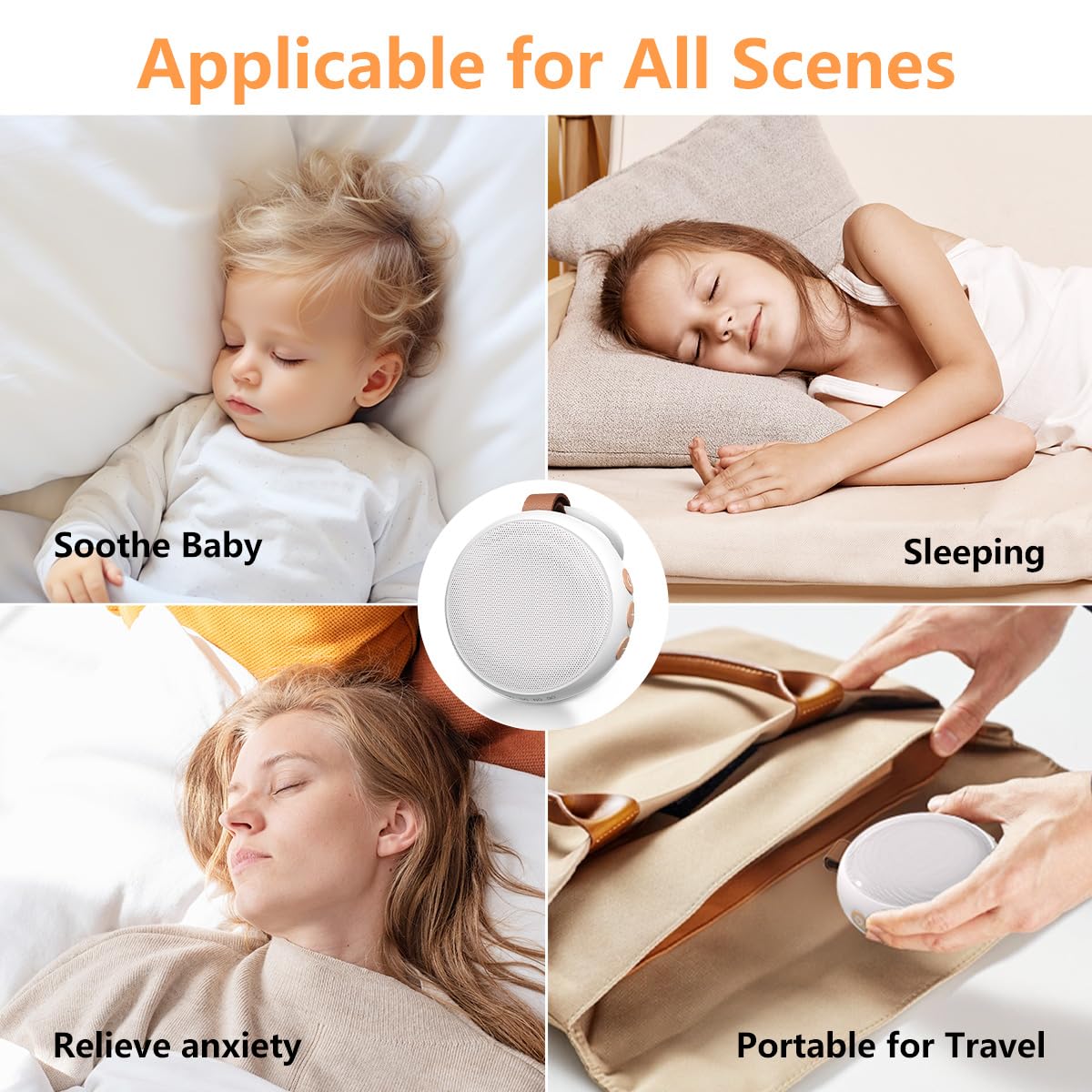 - 30 Non-Looping Sleep SoundsThis mini white noise sleep machine provides white noise, brown noise, pink noise, fans, rains, lullabies, meditation, heartbeat and other realistic natural sounds, which can help create a peaceful and calming environment for sleeping, relaxation, work or concentration for baby, kids, adult.