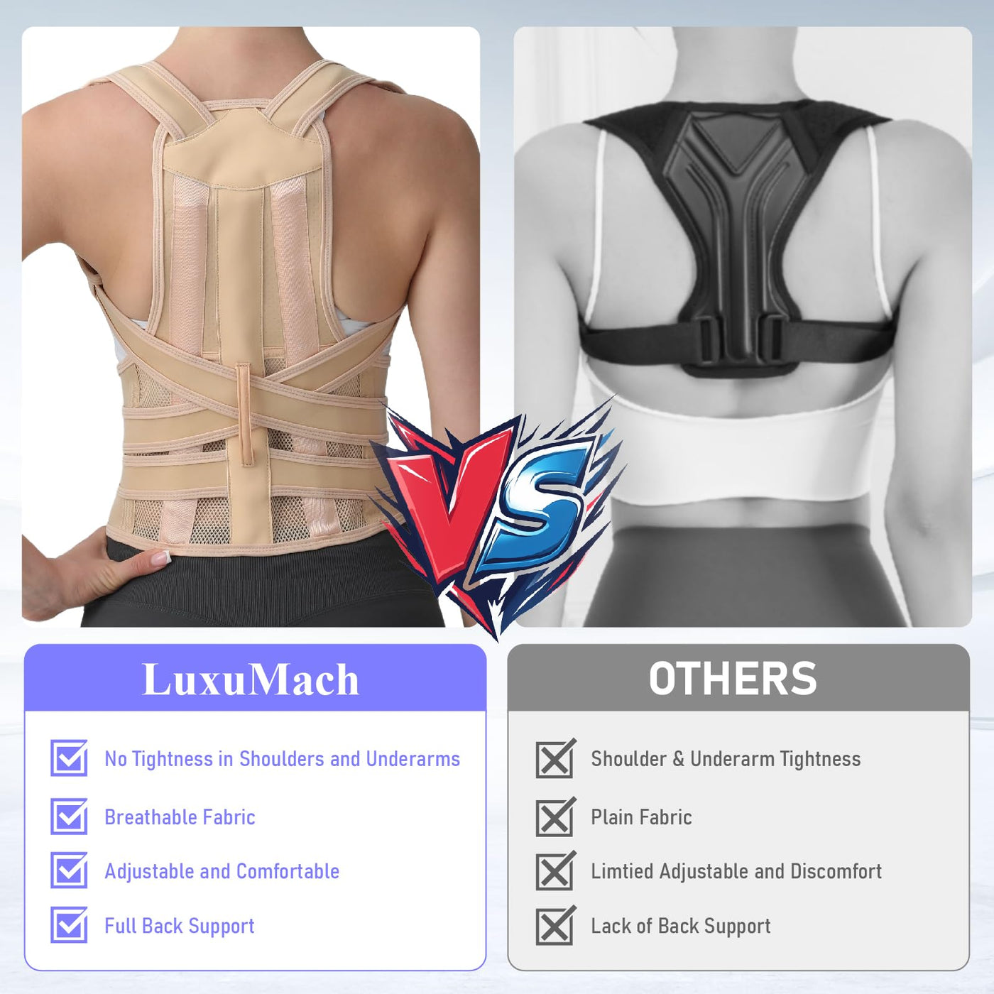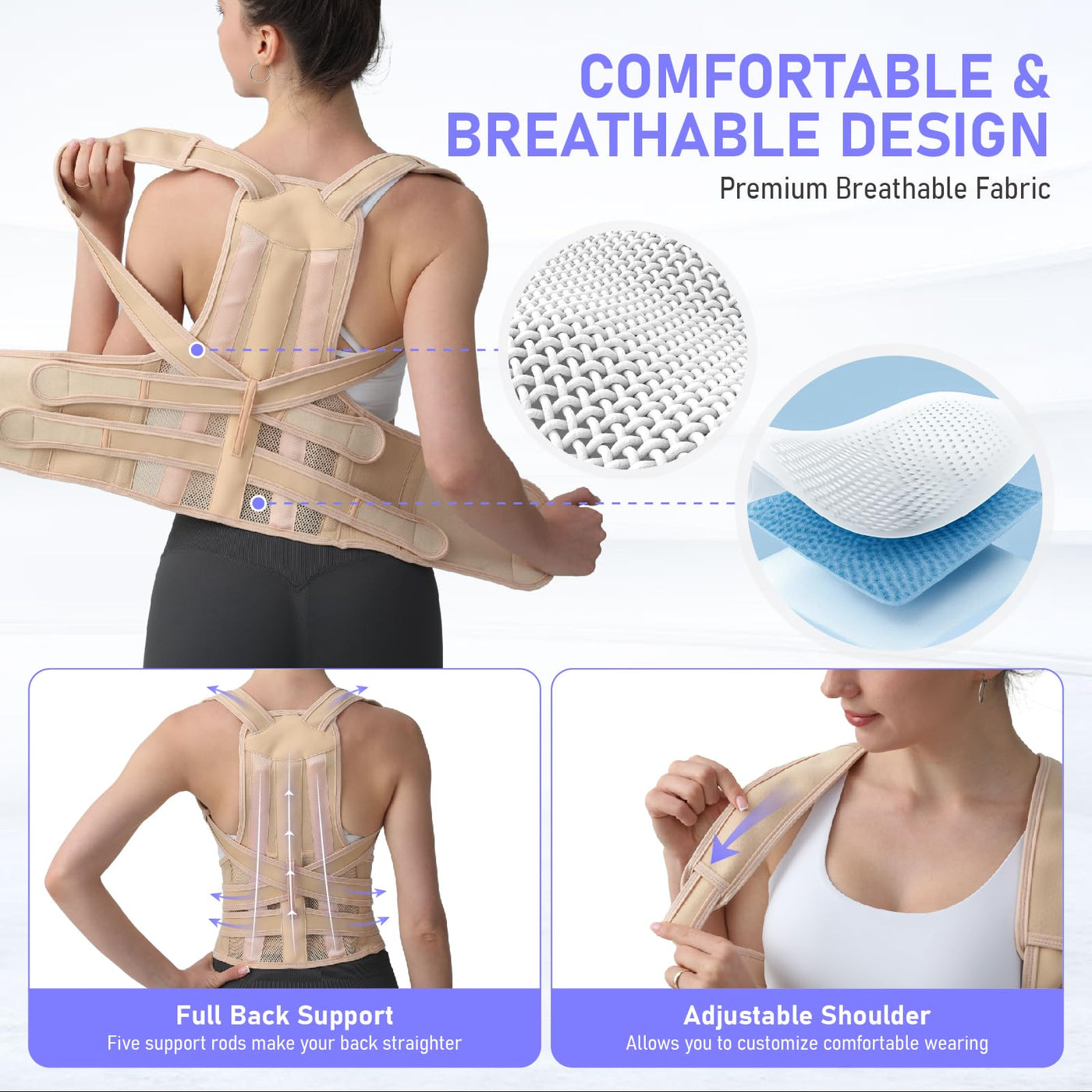 - Ergonomic Back Brace Posture Corrector: Featuring 5 flexible ABS support bars, the adjustable brace supports your back, shoulders, and lumbar spine, helping correct posture and relieve shoulder and lower back pain.