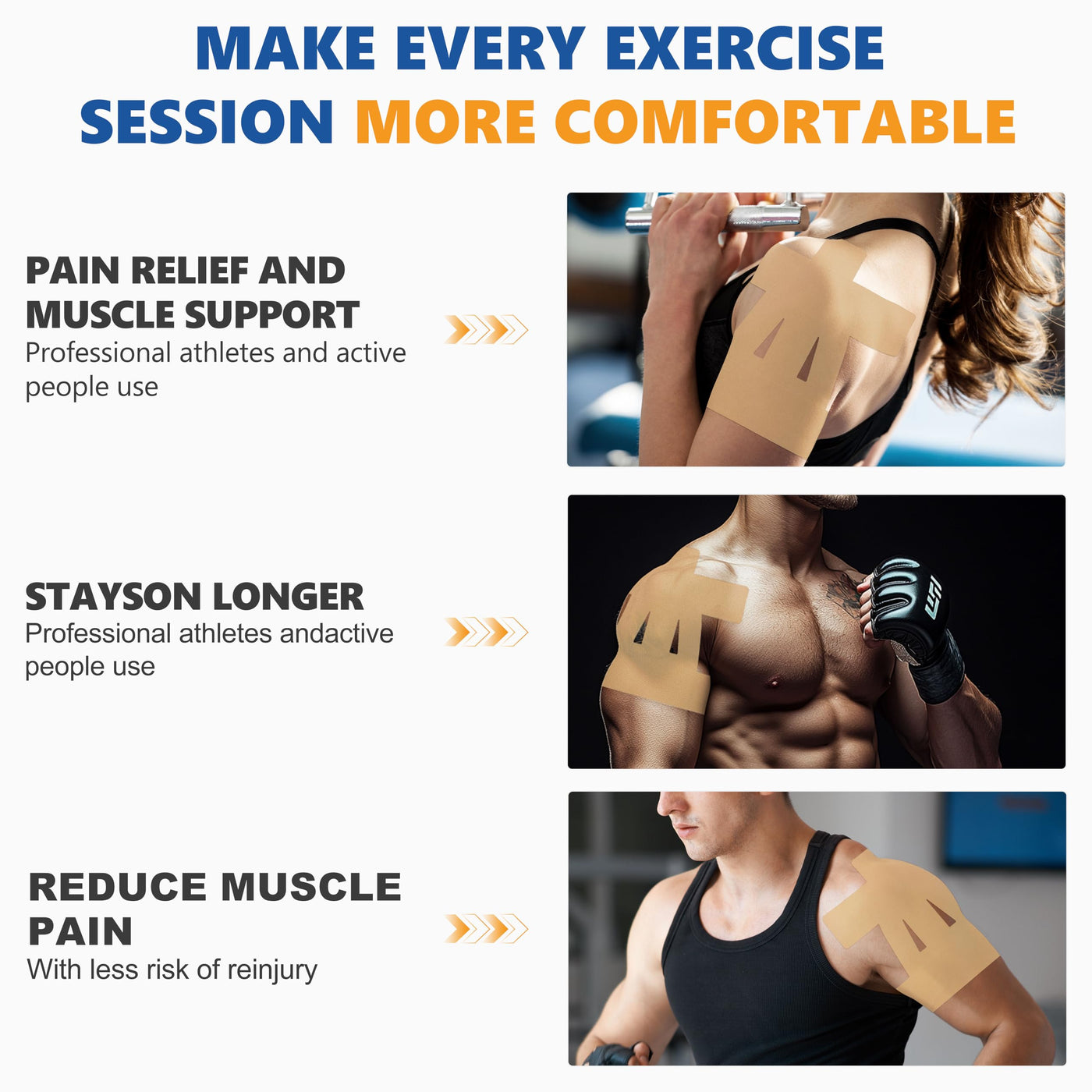 - Waterproof, Sweatproof & Long-Lasting Hold Made from breathable cotton and advanced adhesive, our shoulder tape stays on during showers, workouts, or even swimming. This durable elastic sports tape keeps your shoulder supported under any condition. Please note that the skin should be clean and dry before using the bandage, do not apply moisturizer or essential oils, and if there is too much body hair, it is recommended to shave it off to avoid affecting the adhesion effect and causing pain when tearing off