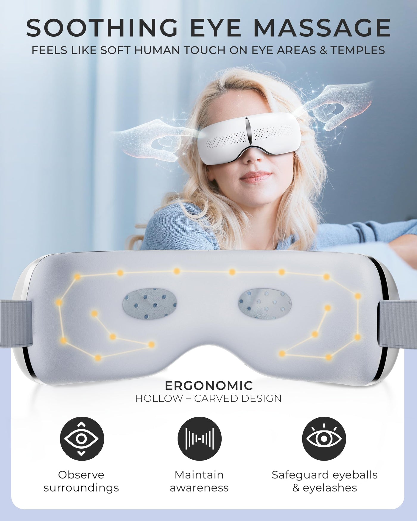 - Awareness with Vision Windows: The eye holes are designed to keep you aware of your surroundings while you relax, ensuring no pressure on your eyes or eyelashes. With a snug fit and a foldable design, this portable eye mask massager is perfect for home, office, or while travelling - providing convenience and comfort wherever you go.