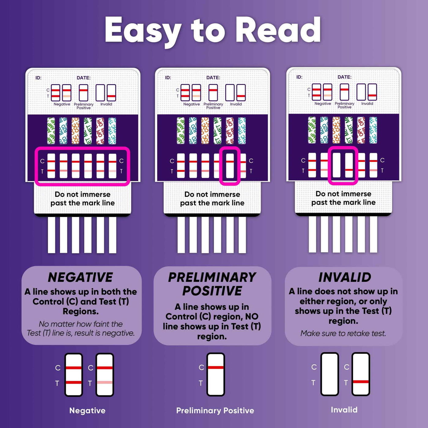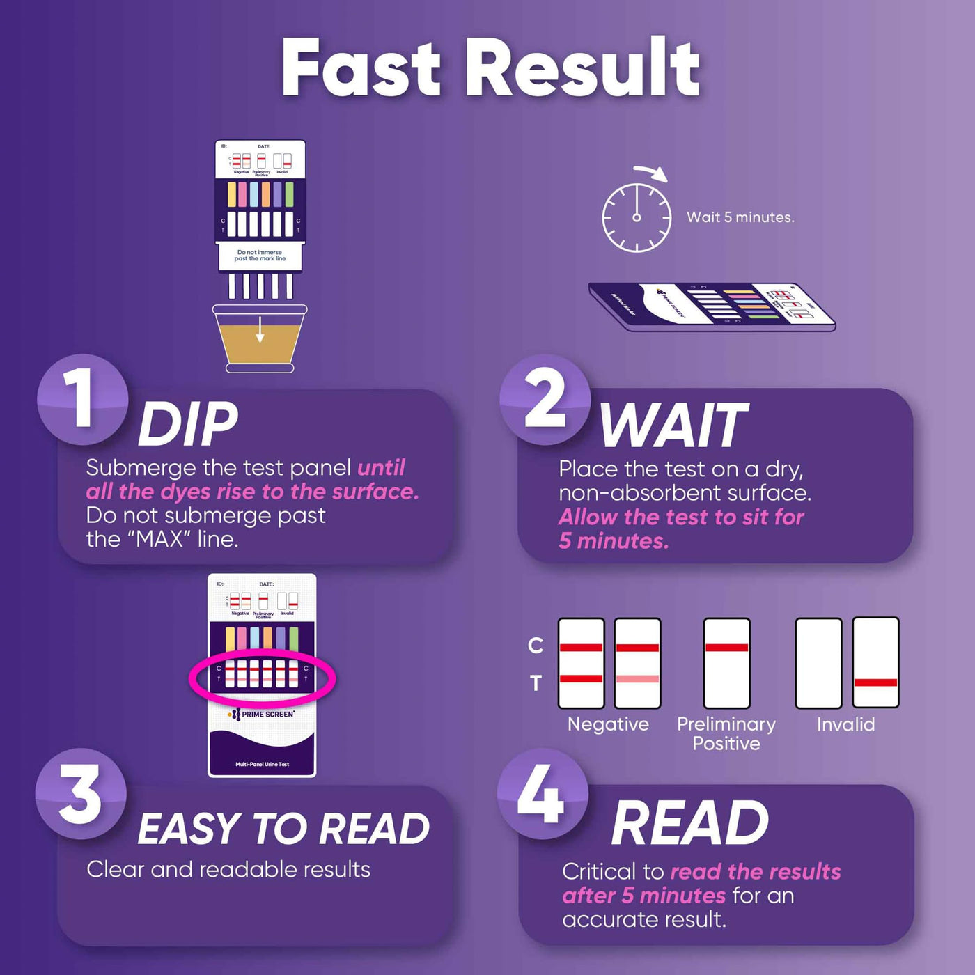 - Easy and Fast - Dip the test in urine for 10 seconds and read the result in 5 minutes. 2 lines appears if clean; 1 control line only appears if not clean.