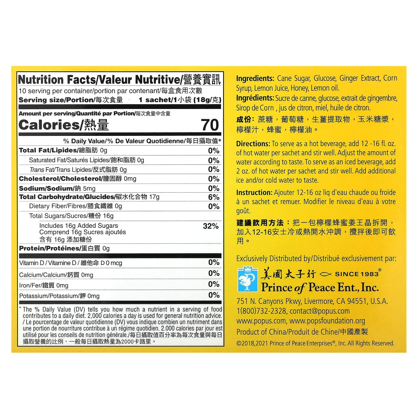 Prince of Peace Instant Natural Lemon Ginger Honey Crystals, 10 Sachets – Instant Hot or Cold Beverage for Nausea Relief and Soothes Throat – Easy to Brew Ginger and Honey Crystals 10 Count (Pack of 1)