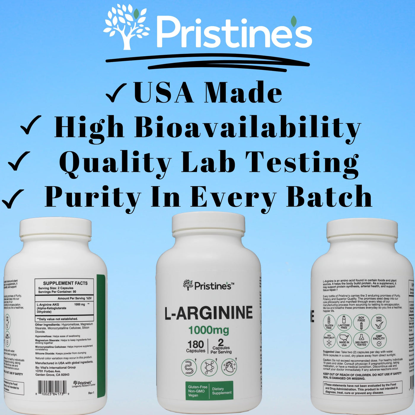 PRISTINE'S L Arginine Supplements for Men & Women - 1000mg Capsules 90 Day Supply Nitric Oxide & Pre Workout Amino Acid Support 1