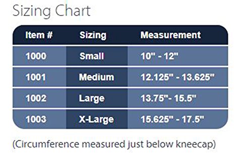 - SIZING: Measure circumference just below patella (knee cap). Small (10"-12"), Medium (121/8"-135/8"), Large (133/4"-15.5"), X-Large (155/8"-17.5"). If between sizes, order larger size.