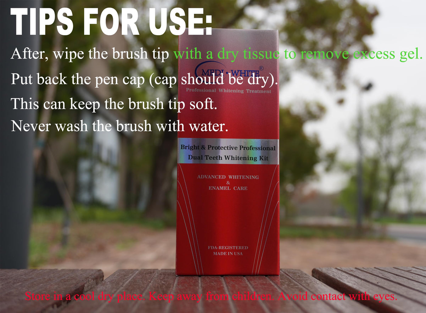 - Easy to Use Our product is safe for at-home teeth whitening. For best results, start by brushing and drying your teeth. With the soft brush tip of the pen, gently apply the 38% HP-CP gel to every tooth and crevice for comprehensive whitening, and wait for 20-30 minutes. Then rinse your mouth with clean water. After that, apply the remineralizing gel to the target teeth, wait for 5-30 minutes. Then rinse your mouth with clean water again. With regular use, your teeth may be brightened by 4-8 shades.