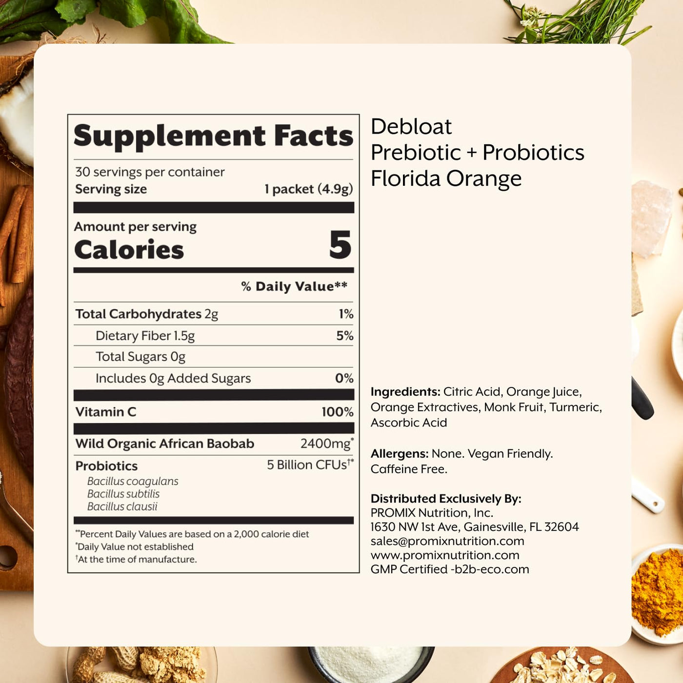 ProMix Nutrition Debloat Prebiotics and Probiotics with Baobab - Rich in Vitamin C, Bloating Relief, Immune Support - Orange - 30 Servings (Pack of 30) Florida Orange 0.17 Ounce (Pack of 30)