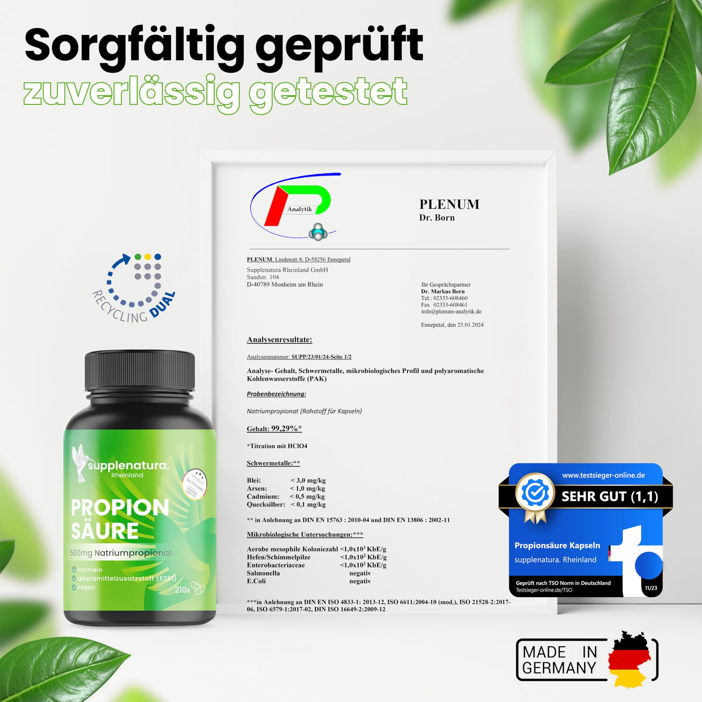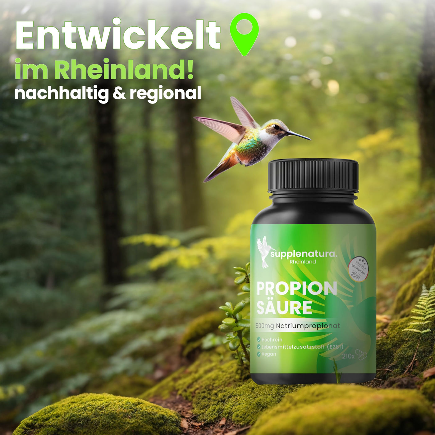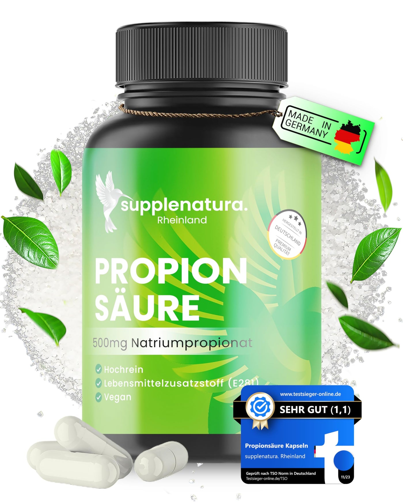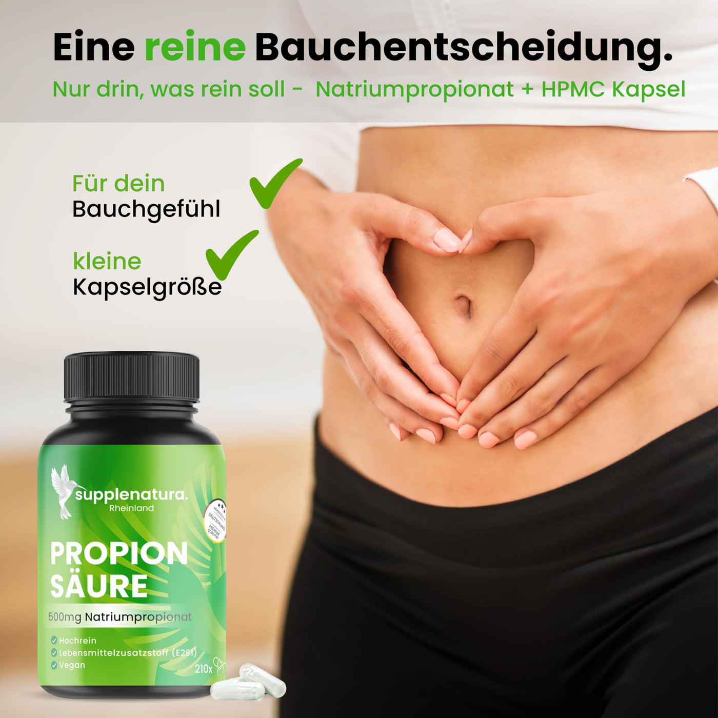 Propionic acid - 210 capsules (500mg) - high-purity sodium propionate - laboratory tested - vegan - German production - propionic acid capsules from SUPPLENATURA® neutral in taste