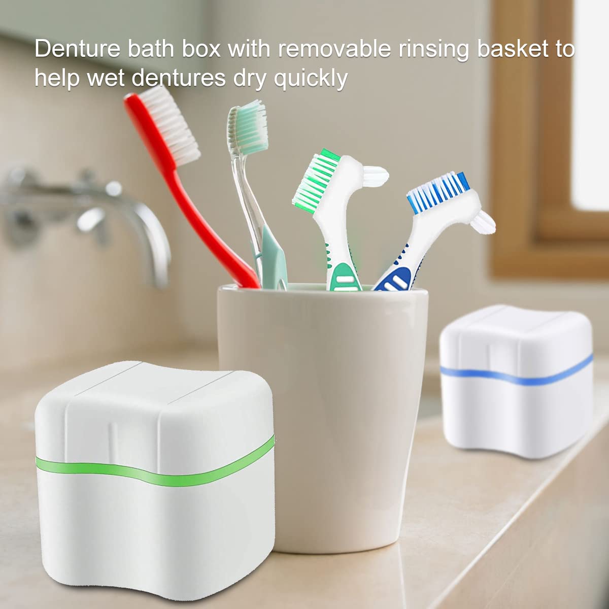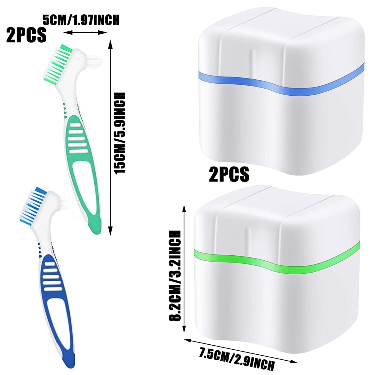 - INCLUDED IN THE DELIVERY You will receive two denture boxes (green + blue); Two denture toothbrushes (green + blue), total 4 pieces, enough for your daily use and replacement.