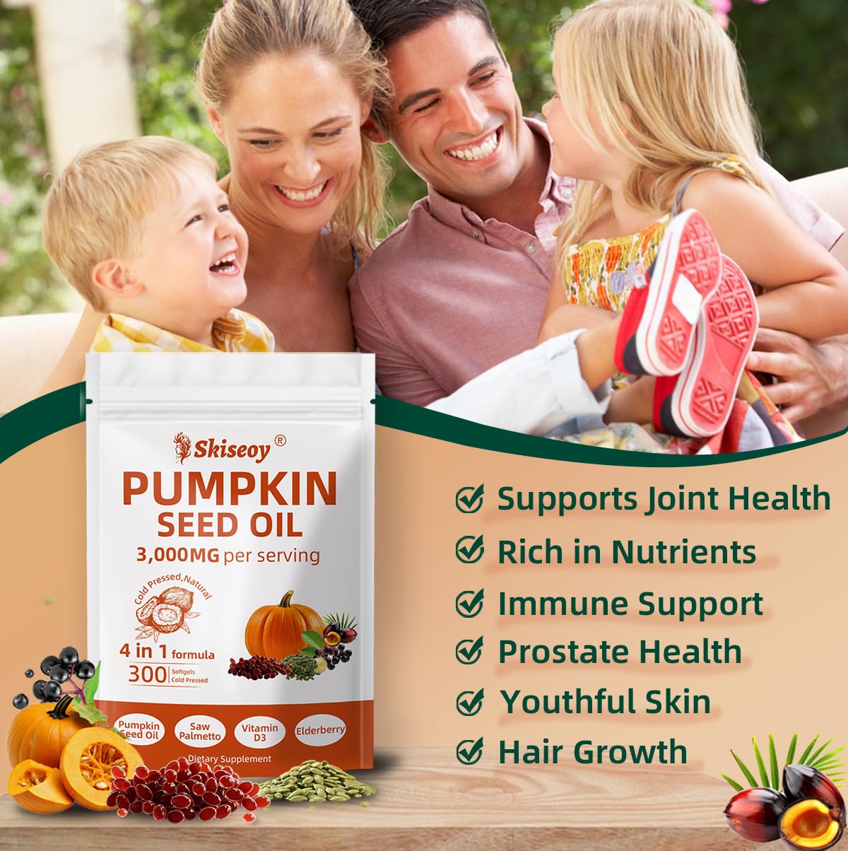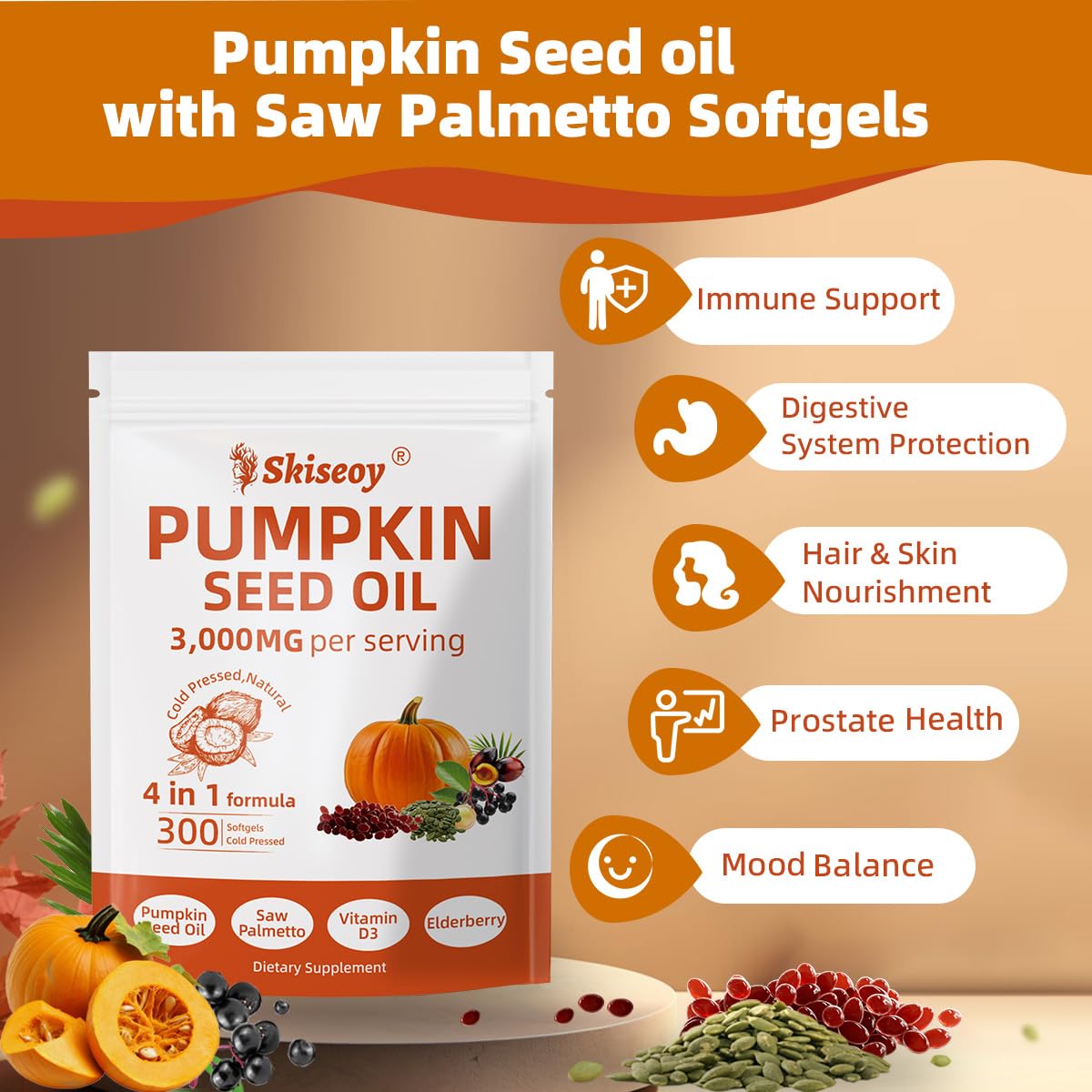- 4-IN-1 Pumkin Seed Oil Softgels: 4-IN-1 Pumkin Seed Oil softgels contains 3,000mg pumkin seed oil each serving with saw palmetto, elderberry extract, and vitamin D3. This powerful combination helps support immunity and digestive health, contributing to overall well-being and nutrients for daily balance.
