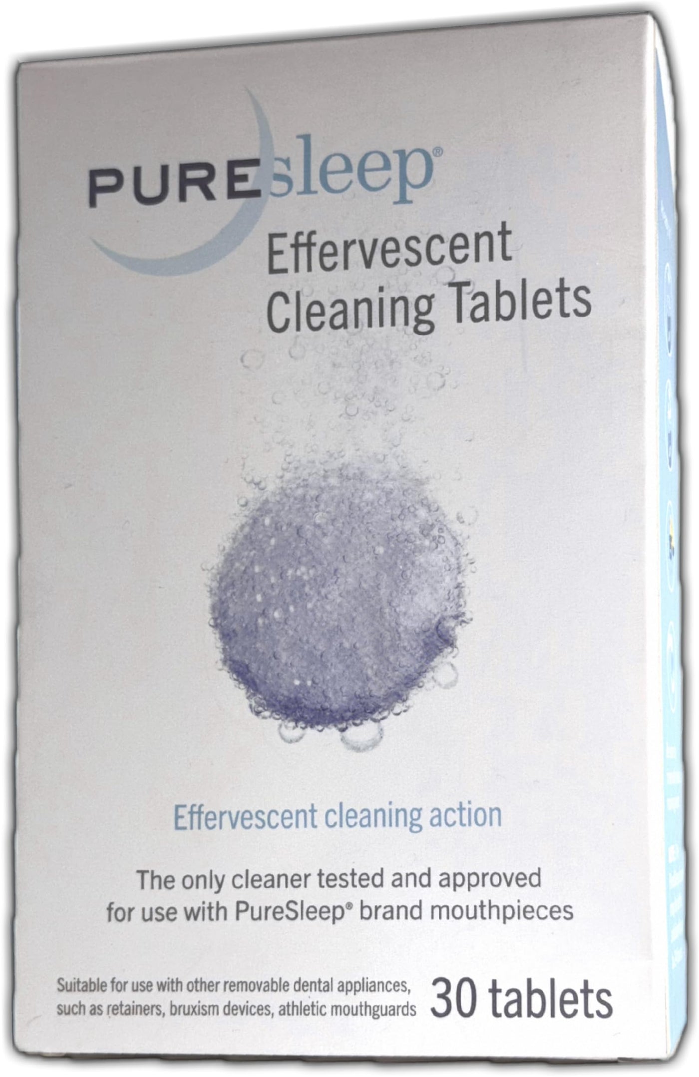 PureSleep Cleaning Tablets are specially formulated to clean and sanitize your PureSleep Anti-Snoring Mouthpiece or other reusable dental appliance. With minty blue effervescent cleaning action, PureSleep Cleaning Tablets are the trusted choice for keeping your mouthpiece squeaky clean and protecting its integrity.
