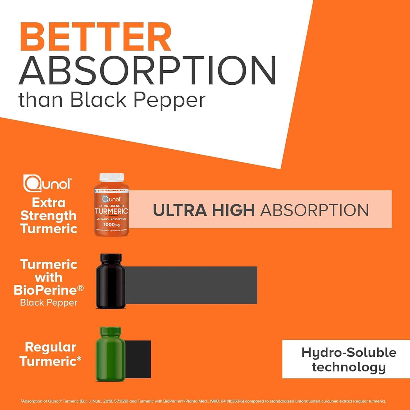 - 40X BETTER ABSORPTION: Qunol Extra Strength Turmeric Curcumin complex has a patented hydro-soluble technology delivering Ultra High Absorption when compared to regular turmeric which doesn't dissolve in water, dissolves poorly in fat, and absorbs poorly