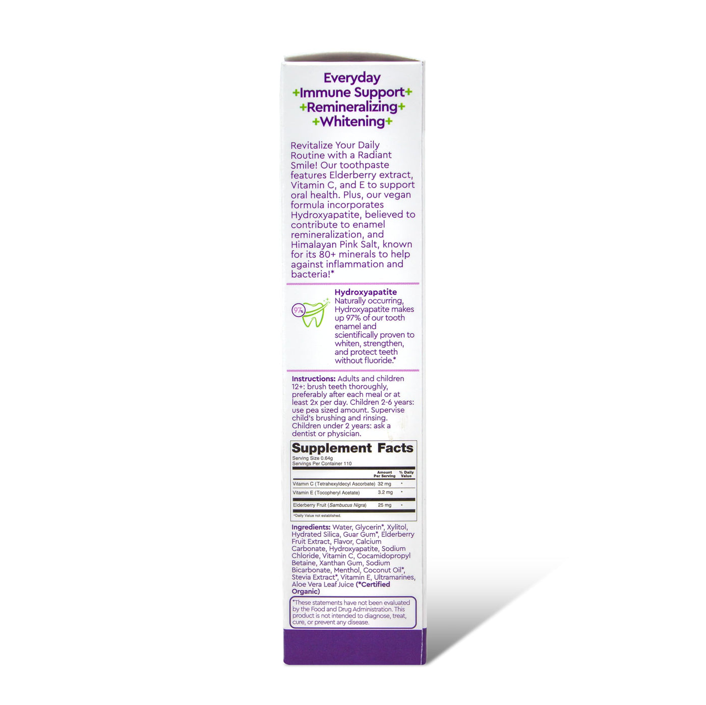 - Elevate Your Oral Defense: Experience the ultimate boost with Immuni-Minty Immune Support Toothpaste in Elderberry Mint flavor. Our triple action formula, infused with Elderberry, Vitamin C, and E.