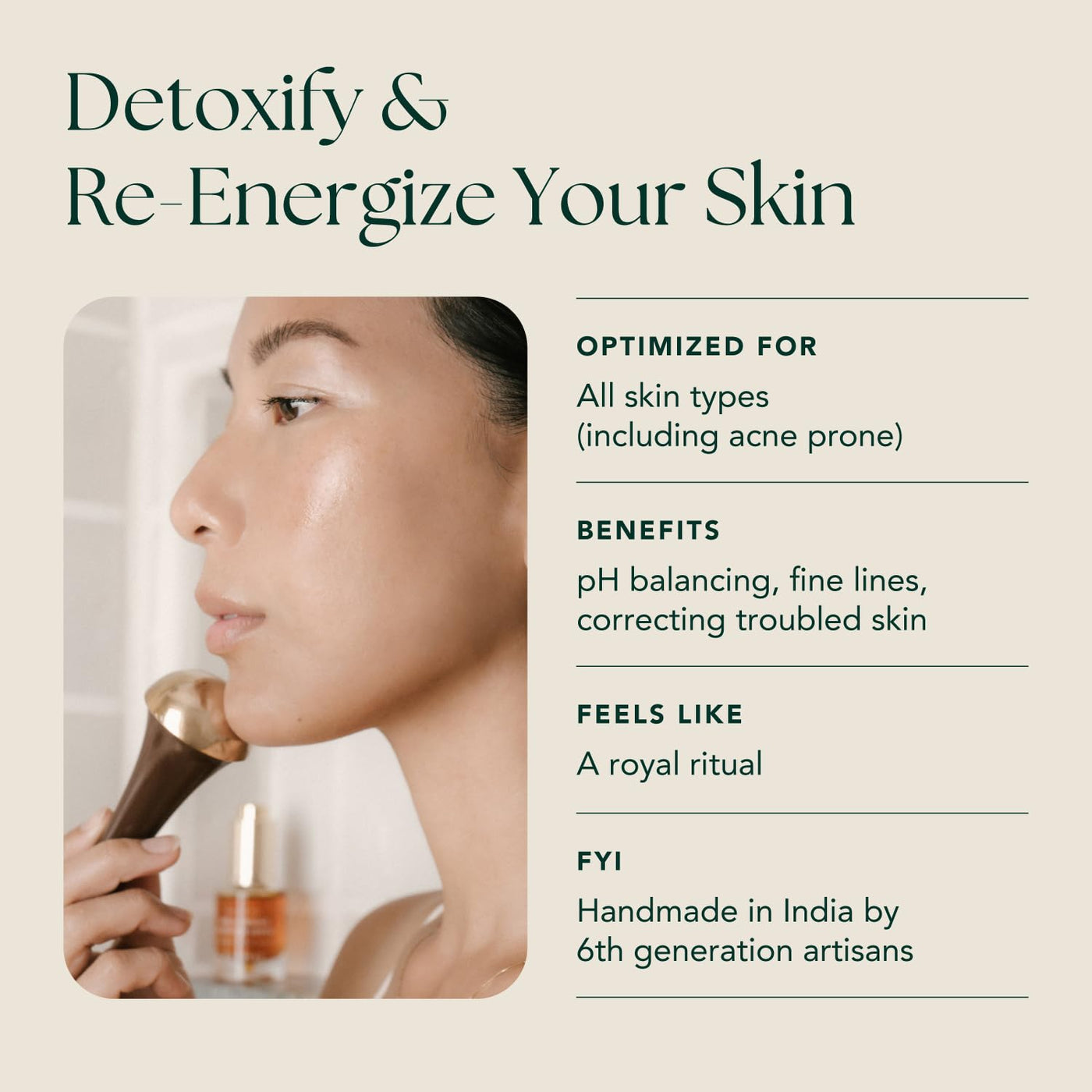 - Handmade Depuffing Facial Massager - The wand is hand made in Rajasthan, India by 6th generation kansa artisans. Used by practitioners of Ayurveda for centuries, skincare tools using pure Kansa, a sacred mix of copper and tin, lowers and balances skins pH to help calm irritation and redness.
