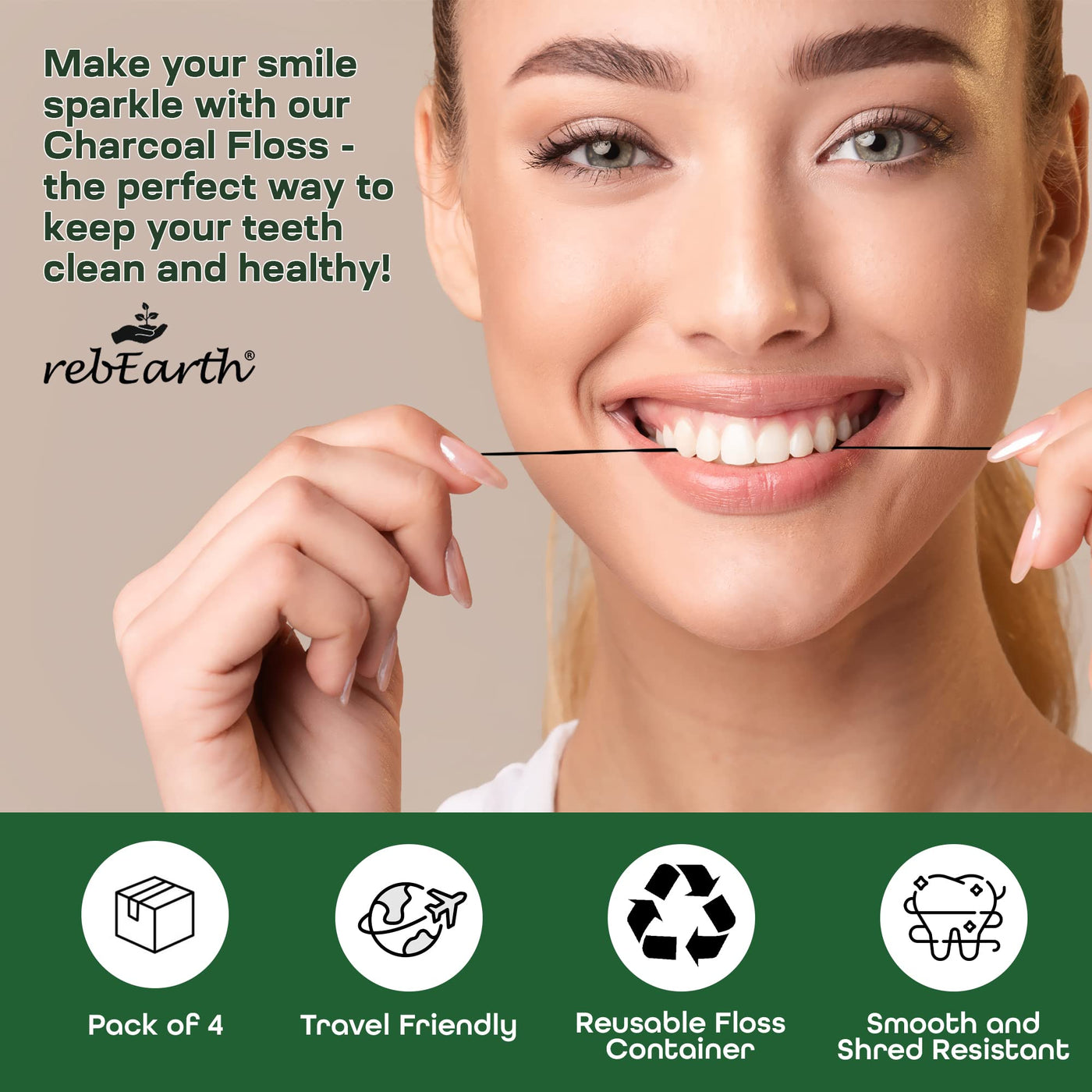 rebEarth Natural Deep Clean Charcoal Floss - Oral Care Dental Floss w/Mint Flavor, 30m Tooth Floss in Glass Container, Bamboo Floss w/Reusable Floss Container, Smooth & Shred Resistant (Pack of 4) 4 Pack Dental Floss