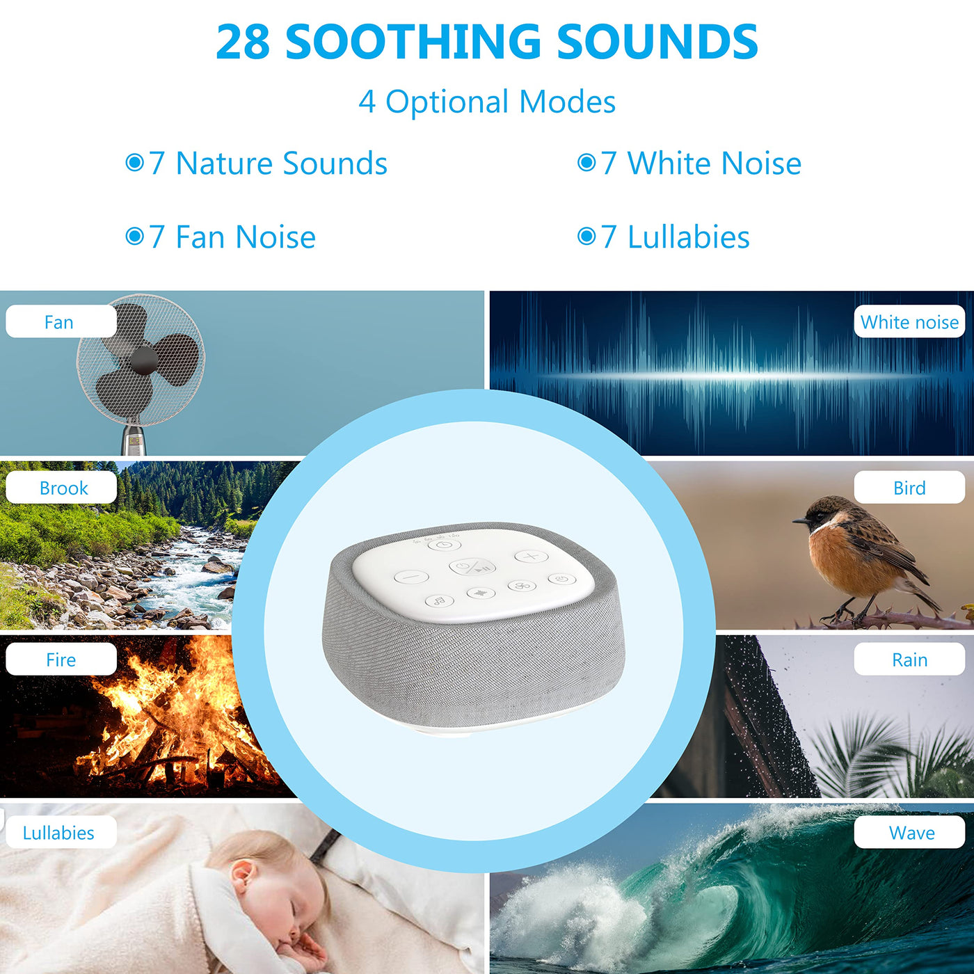 - Customize Your Sleep-28 Smooth Sleep Sound Machine: Choose from 28 different soothing sounds, separated into 4 buttons, including 7 Nature Sound Effects(Thunderstorm, Stream, Ocean wave, Campfire, Bird chirping, Cricket, Frog chirping), 7 White Noise, 7 Fan Sound, and 7 Lullabies. Find your favorite sound and enjoy a better and deeper sleep.